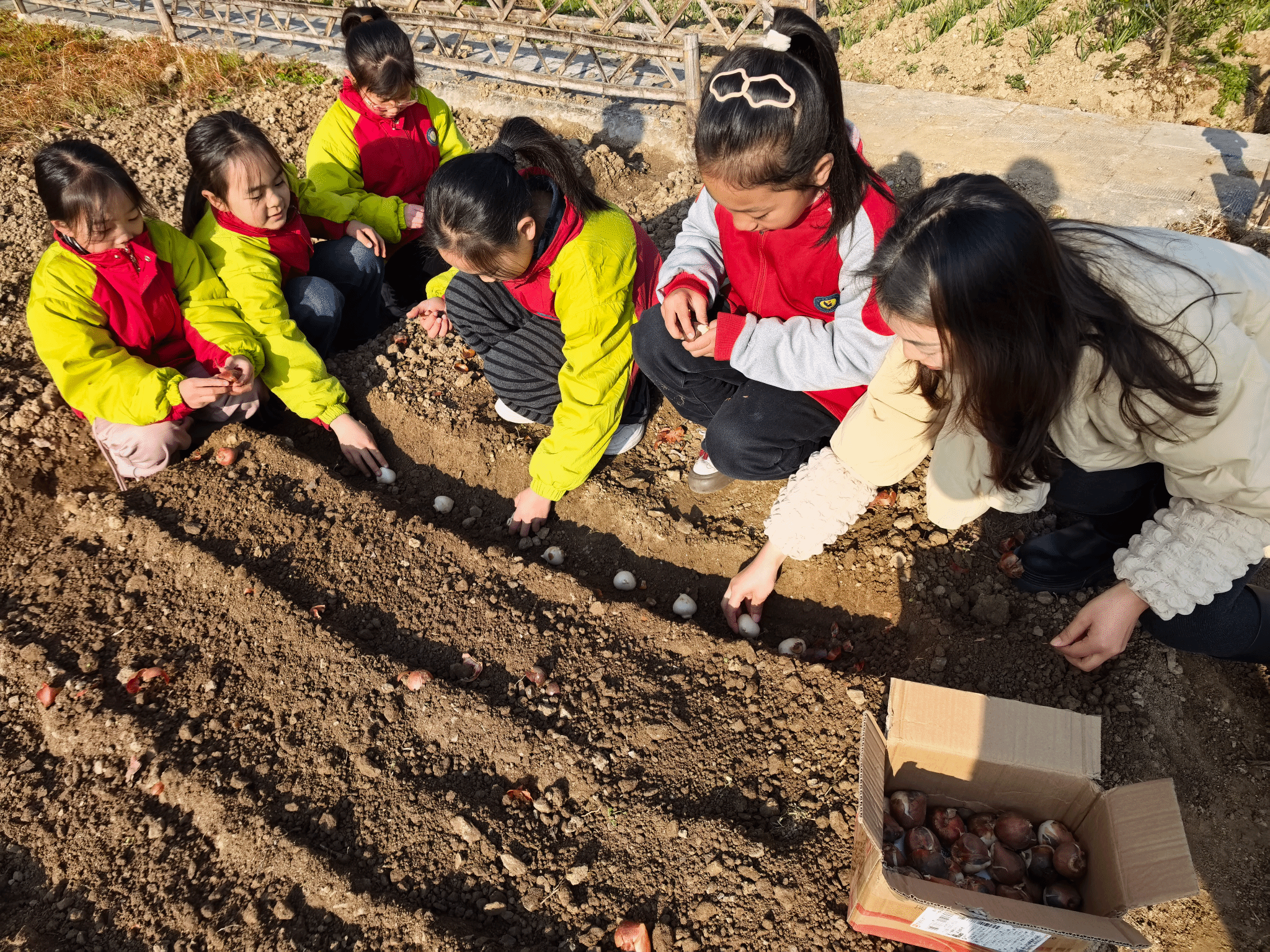 随后,种植实践正式开始。孩子们分工协作、默契配合:有的小心翼翼拿着种球,有的用小铲挖出适宜深度的小坑,有的轻轻将种球放入并覆上细土。每一个动作都透着认真与细致。老师们穿梭其间,及时给予指导,手把手帮助学生掌握覆土厚度与力度,确保种植规范科学。冬日暖阳下,耕读园里红黄色的校服与褐色泥土交相辉映,孩子们的欢笑声、讨论声和泥土的清香交织,勾勒出一幅生动的劳动实践画卷。