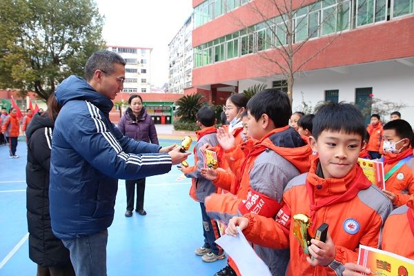 在全场热烈的掌声中,获奖队员们在国旗台前列队,校领导们为他们颁发了奖杯和奖状。