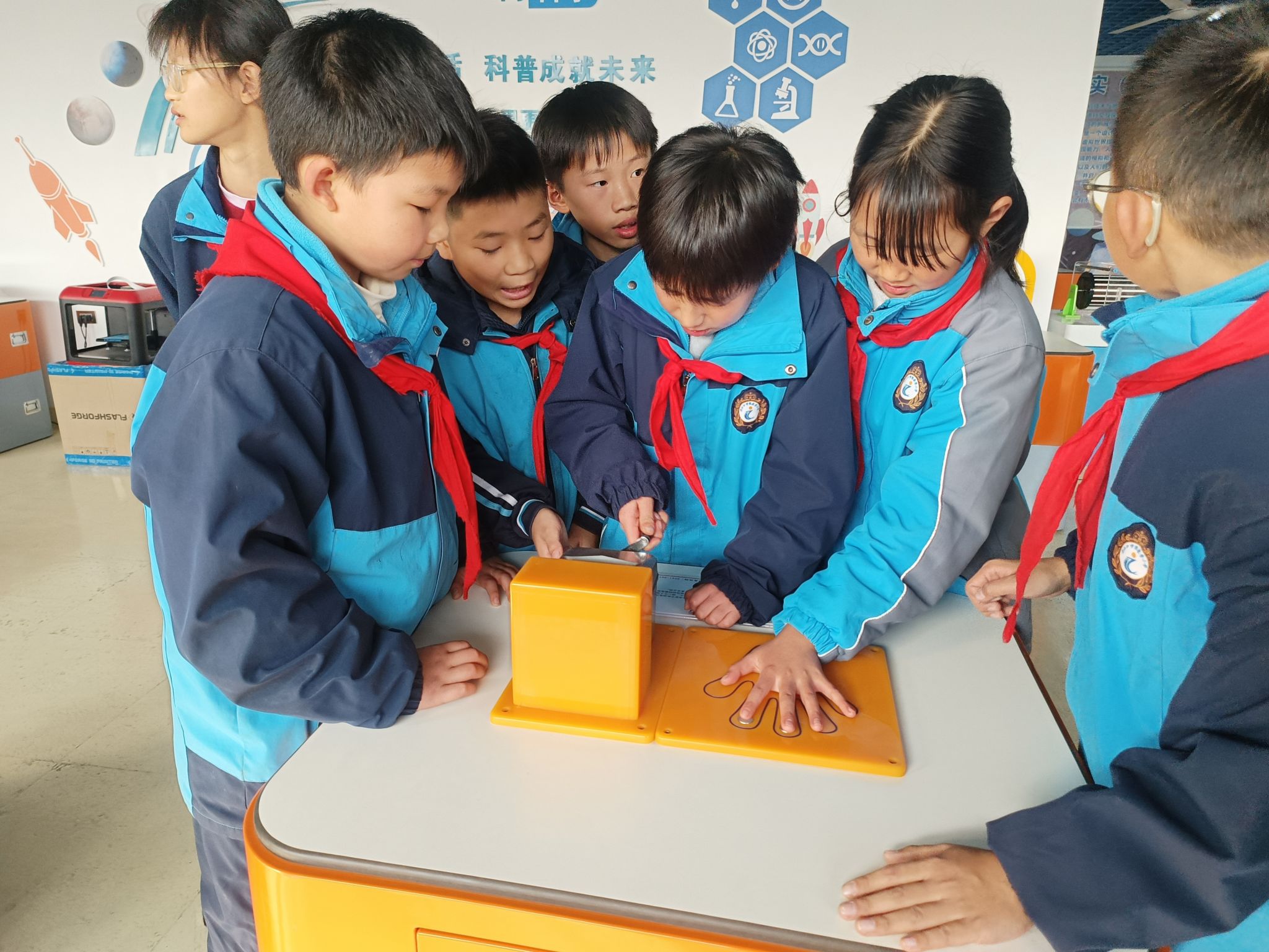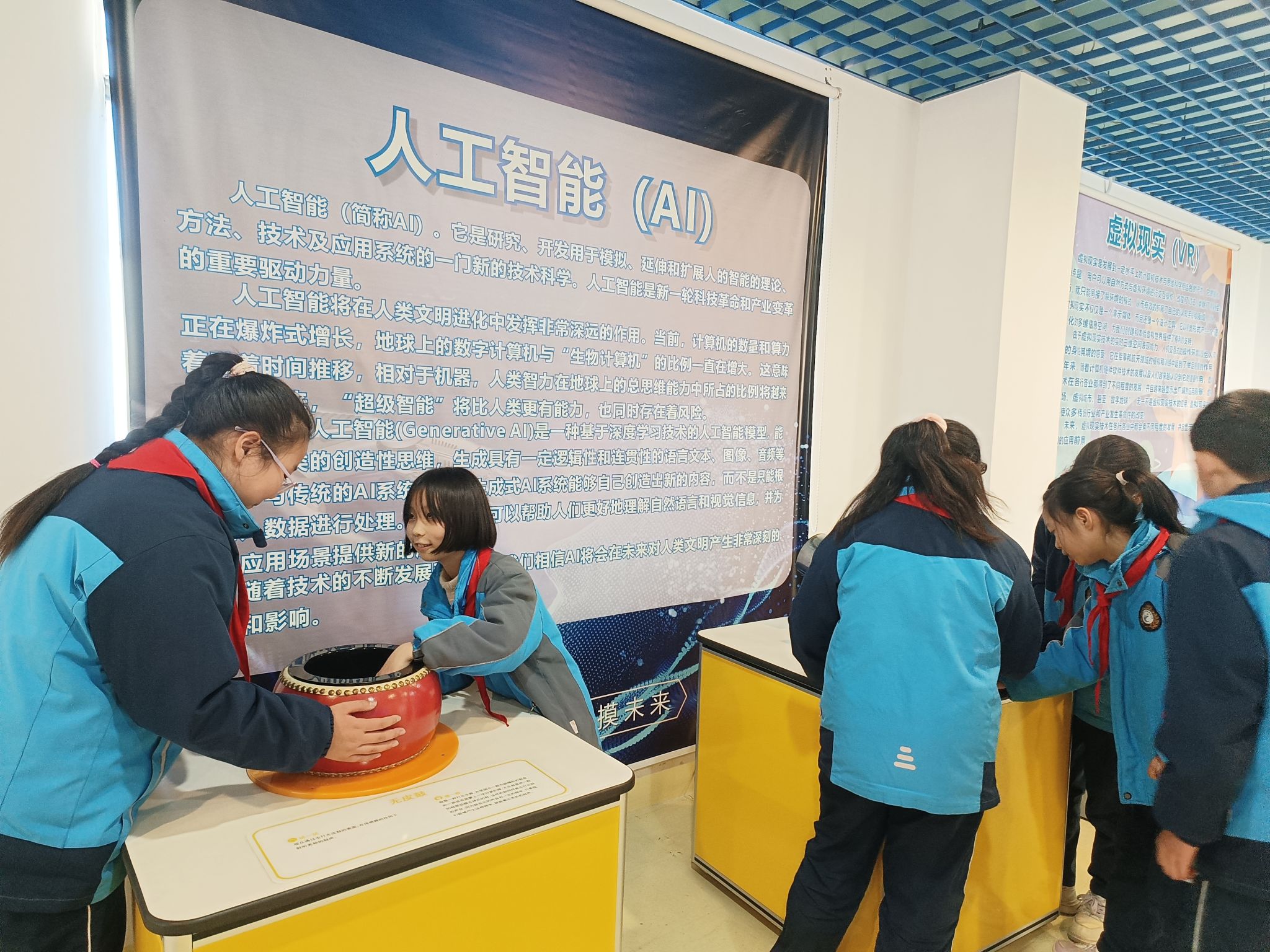 当日下午,学生们走进科技馆,瞬间被各类趣味展项吸引。在人工智能(AI)科普展区,电子鼓互动装置前围满了孩子,大家伸手触碰鼓面,感受科技与音乐融合的奇妙音效,还对照展板上的AI知识讲解,互相分享自己对人工智能的理解。气流实验区更是人气十足,当彩球被气流稳稳托在空中时,孩子们纷纷瞪大眼睛、伸手试探,口中不断发出“哇”的惊叹,讲解员趁机讲解伯努利原理,让抽象的科学知识变得直观易懂。