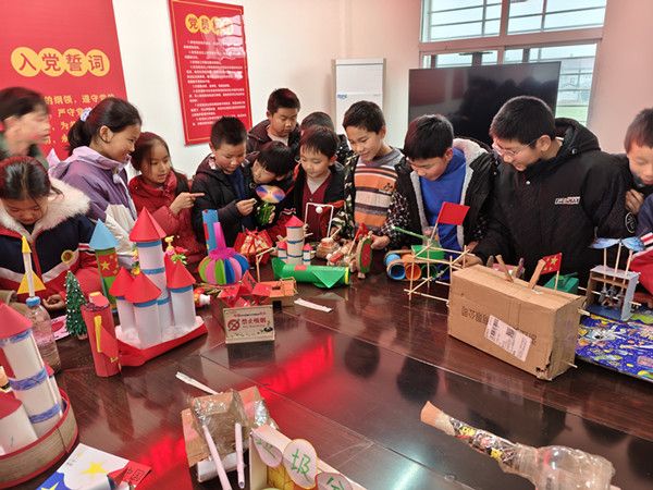 活动现场,火箭模型、手工鸟巢、机械装置等作品琳琅满目 —— 纸杯、塑料瓶、纸箱等日常废弃物,在孩子们的巧手下变身成充满创意的科技小发明。同学们围在展台前,有的展示自己制作的 “火箭发射台”,兴奋地讲解 “燃料仓” 的设计思路;有的摆弄着简易机械装置,盯着齿轮转动的节奏目不转睛;有的蹲在手工鸟巢旁,指着编织的纹路分享 “仿生结构” 的灵感来源,眼神里满是对科学的好奇与热情。