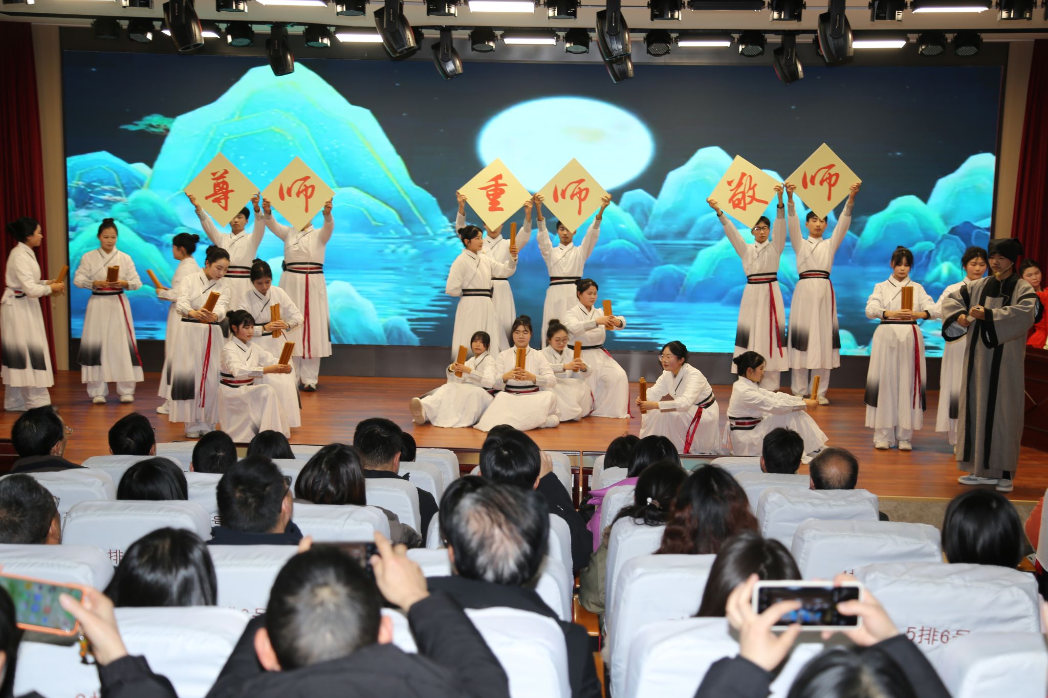 “请全体起立,整理衣冠,向‘德’致敬!”在行崇德礼环节,随着主持人的提示,全体人员肃立凝神,整理衣襟后向象征师德与美德的“德”字庄重鞠躬。这一鞠躬,既是对道德的敬畏,更是对教育责任的庄严承诺,让“崇德修身”的理念内化于心、外化于行。随后的诵经典环节,高一年级师生精心编排的情景剧精彩上演,通过生动的演绎带领大家穿越时空与经典对话,在沉浸式的艺术熏陶中感受中华优秀传统文化的魅力,进一步深化了对教育家精神的理解与认同。