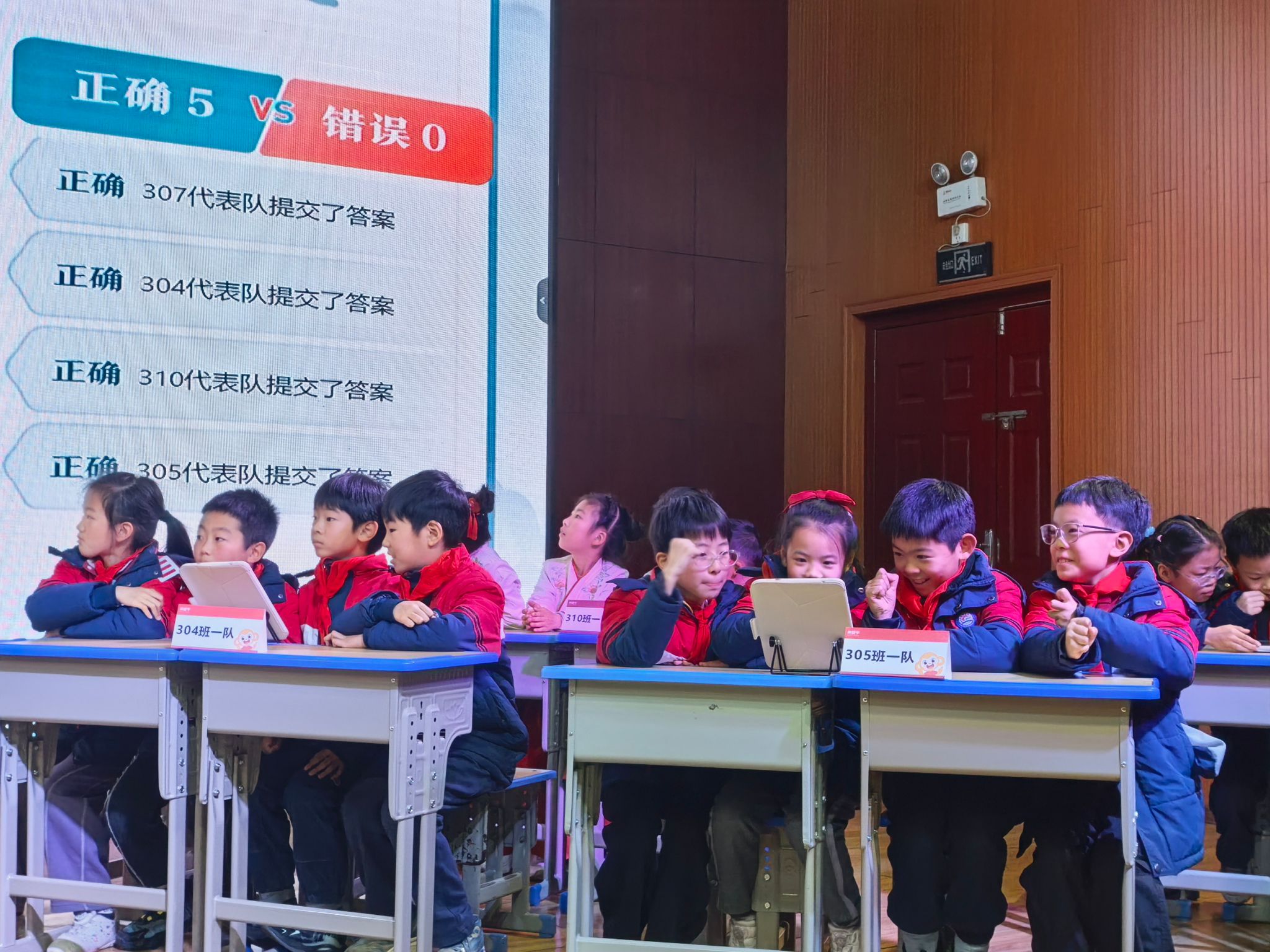 活动在全员参与的“经典诵读”展示中拉开帷幕。三年级各班学生精神饱满,齐声诵读经典篇章。紧随其后的“诗词大会”现场比拼环节,将气氛推向高潮。此前经过班级内部海选,每班择优选拔出的四名选手代表班级“出战”。比赛设“必答题”扎实功底、“你说我猜”默契配合、“飞花令”巅峰对决三大环节,赛程紧张激烈,扣人心弦。选手们沉着应答、机智联动,尤其在“飞花令”环节,佳句频出,展现了不凡的诗词储备与临场反应,赢得了现场师生阵阵喝彩。最终,依据积分评选出优胜团体,并进行了现场颁奖。