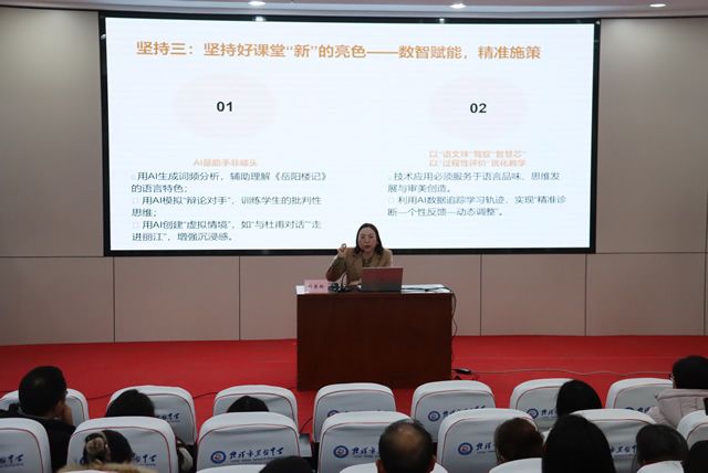 上午的课例展示环节,三节示范课各有侧重,各具特点。钟祥市兰台中学邱瑾老师执教的《钢铁是怎样炼成的》整本书阅读推进课,引领学生深入文本肌理,体悟精神锻造之路;东宝区长宁实验学校罗翠老师呈现的《一滴水经过丽江》,以灵动视角带领观众穿行于诗意山水,见微知著。荆门市龙泉北校丁丹怡老师则以《字字苍生泪,篇篇家国情——杜诗鉴赏》一课,在整合教学中贯古通今,让杜甫的忧思与情怀穿越时空,叩击心灵。三堂课各具匠心,共同诠释了语文教学的广度、深度与温度。