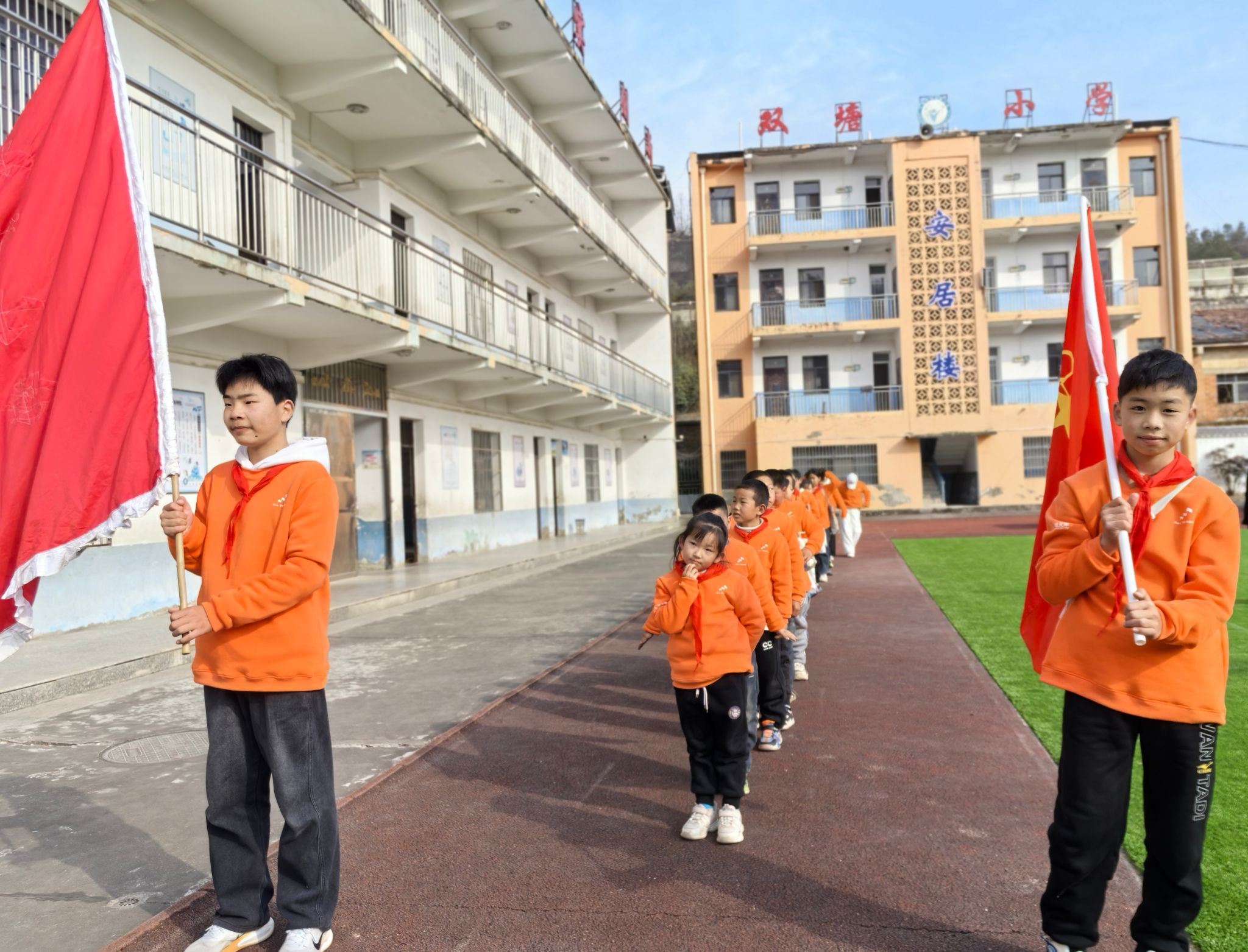 14:10,一面鲜艳的校旗交到六年级旗手手中,学校负责人简短动员令掷地有声:“今天,我们不做‘书中客’,要做‘家乡代言人’,把看到的、听到的、感动到的,统统带回校园!”