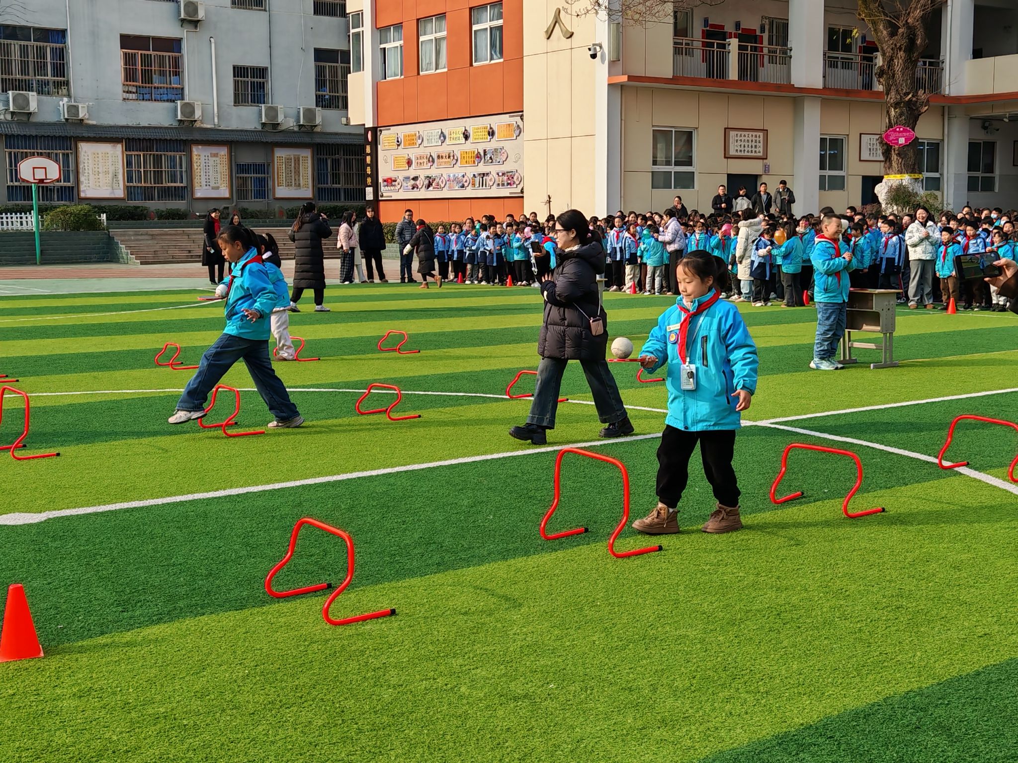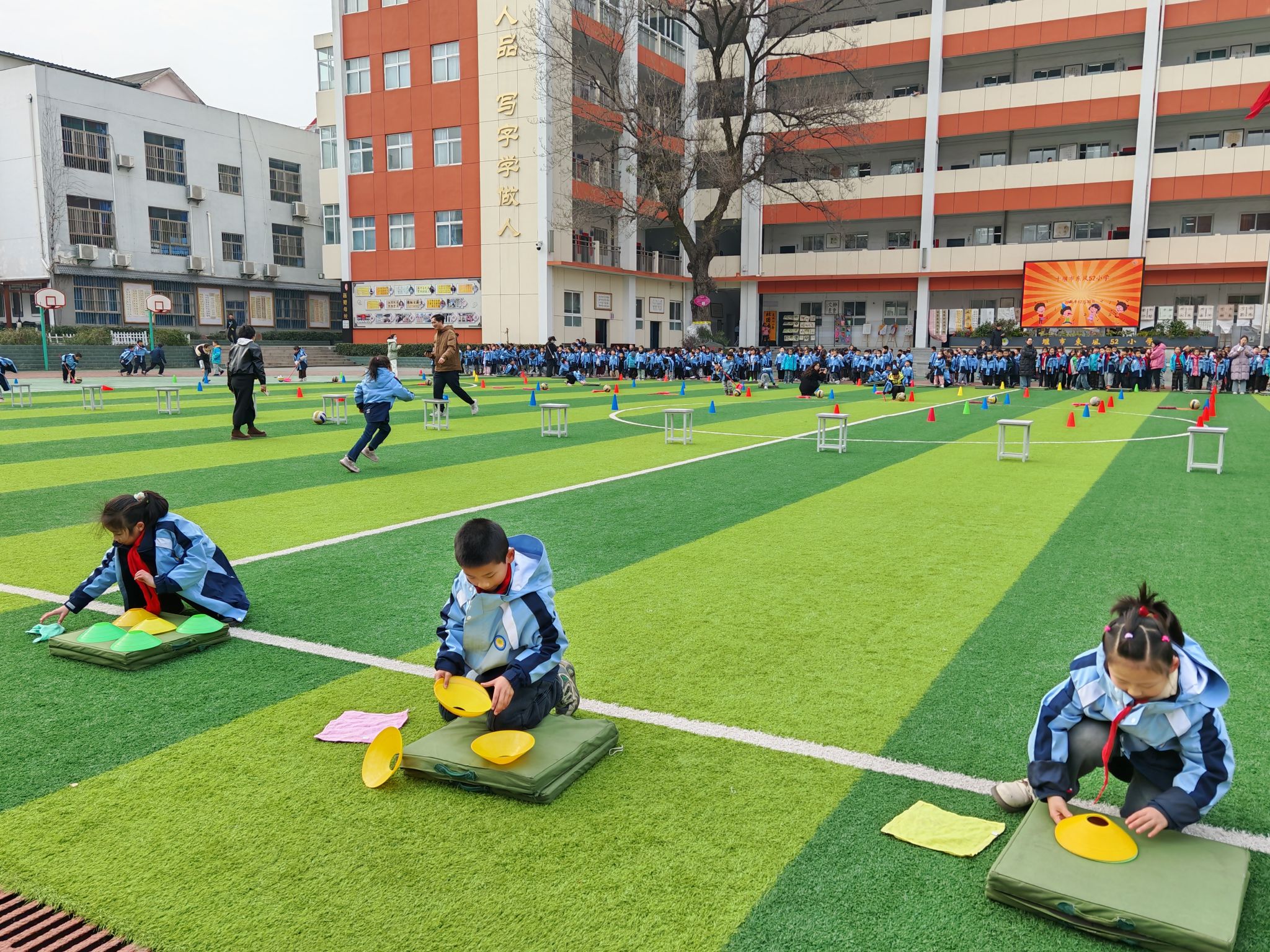 三、四年级活动接着举行。活动以“重走长征路”为背景,创新性地将军体训练与思政答题、劳动技能相结合。“战略转移,勇敢前行”项目中,学生们手持乒乓球拍托举垒球,穿越“巧渡金沙江”、“翻雪山”、“过草地”三大关卡,并在“巧渡金沙江”后进行思政知识问答,在“翻雪山”后完成叠毛巾挑战,实现了体育技能与思政知识的双重考核。“胜利会师”环节则通过背对背夹气球、跳绳等任务,生动还原了红军战士并肩作战的场景,让学生在协作中感受集体胜利的喜悦。活动最后,全体师生齐唱《新年好》,将气氛推向高潮。