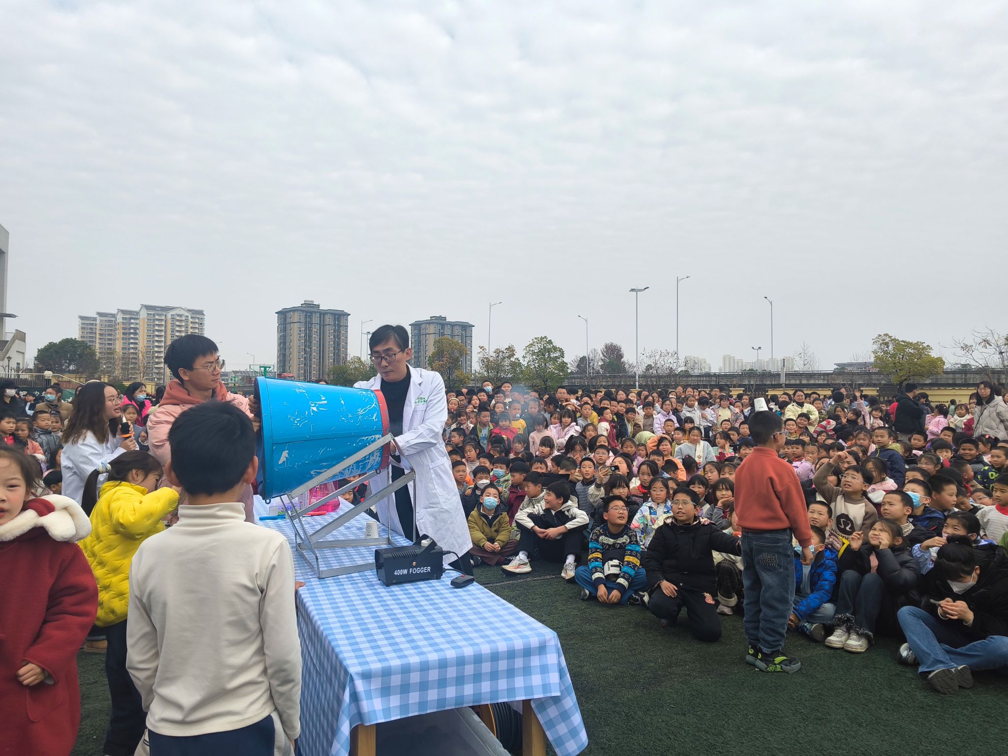 操场中央,精彩纷呈的科学实验秀吸引了所有人的目光。科学老师的“火焰掌”引得同学们屏息凝视,师生同场互动,体验“薪火相传”的神奇;“空气炮”轰然发射,强劲气流瞬间击倒远处纸杯,引发阵阵惊呼;在“火箭发射”环节,随着倒计时结束,自制小火箭直冲云霄,将全场气氛推向高潮……这些妙趣横生的实验,将抽象的科学原理化为直观生动的场景,同学们踊跃参与,沉浸式感受科学的魅力。