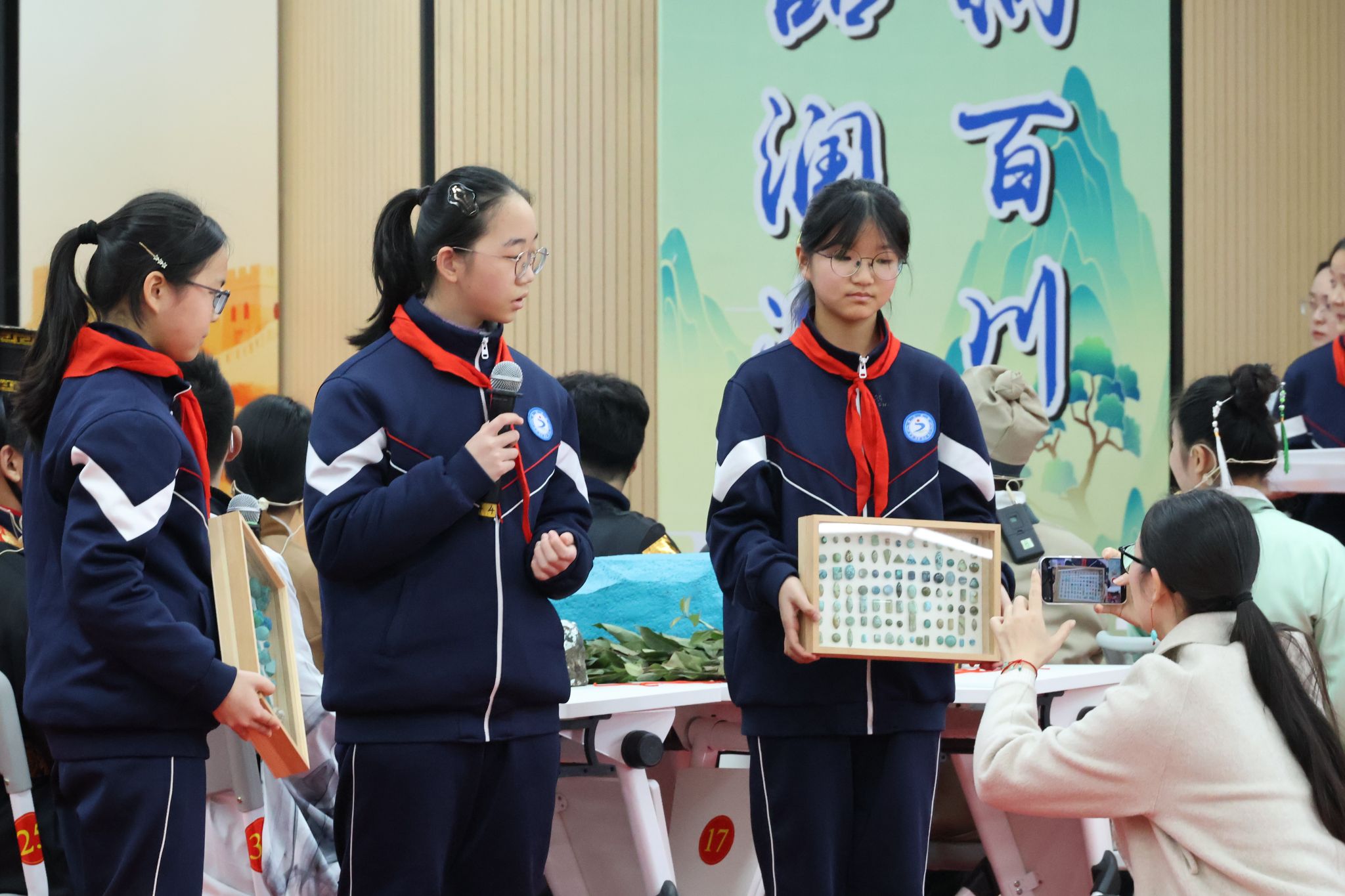 课堂以学生分组探究、成果展示为主要内容,设置历史溯源组、慧眼鉴宝组、工艺体验组、养护传承组四个小组,构建起“情境演绎—实践探究—技能实操—文化升华”的完整教学链条。学生在“做中学、学中思”,不仅掌握了绿松石鉴别、编织、养护等实操技能,更在小组协作中提升了探究能力与创新思维。现场互动与体验,让300余名参会教师共同见证了绿松石的独特魅力。
