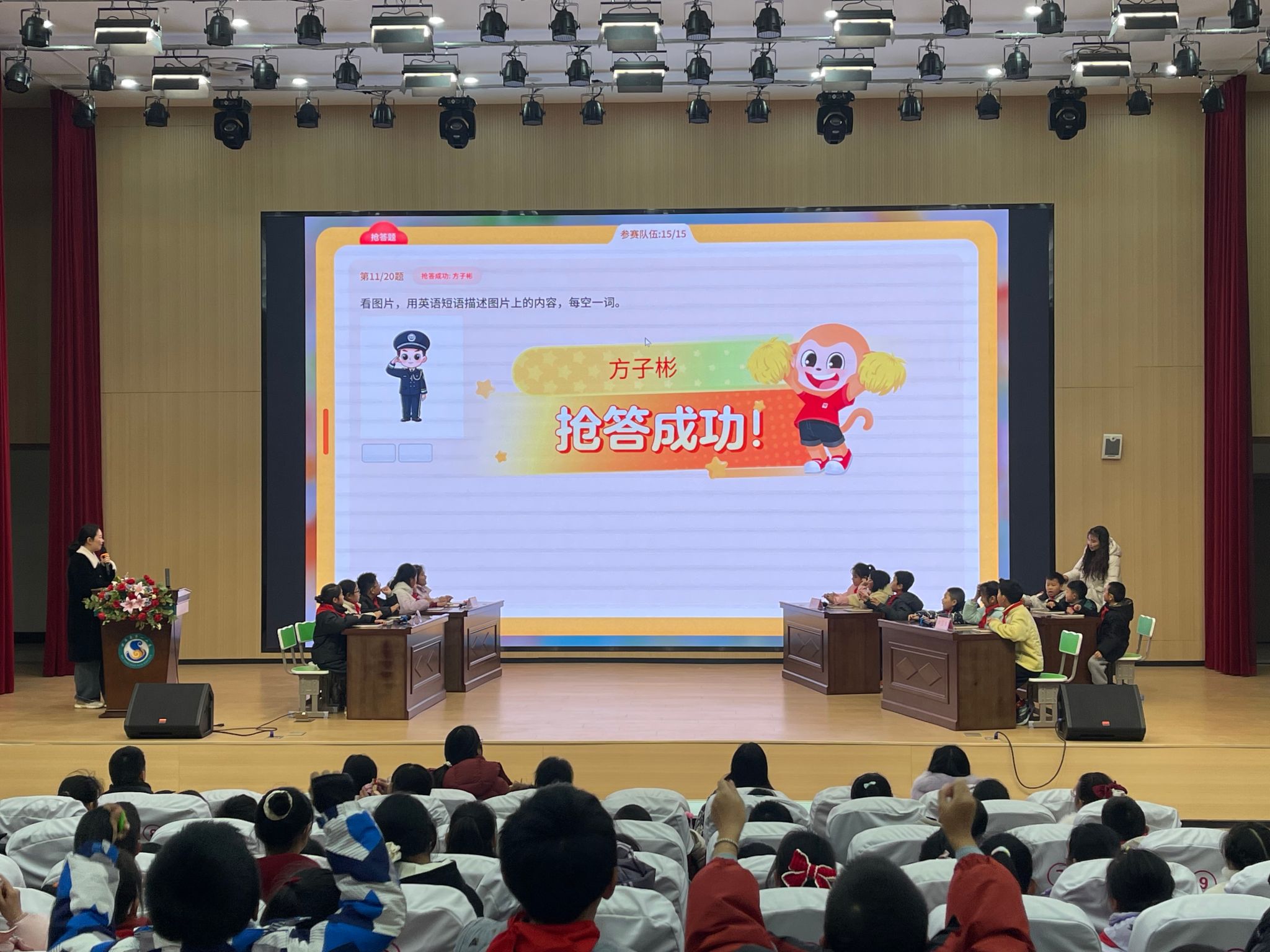 竞赛环节按年级从低到高依次推进,题型设计兼顾趣味性与知识性,贴合不同学段学生的英语水平。3-4年级设置必答题和抢答题两大模块,题目涵盖短文填空、图片场景描述、音频理解、短语选择等多种形式,选手们通过平板限时30秒作答,答题迅速、准确率高,充分展现了扎实的词汇基础与灵活的应变能力。5-6年级在必答题、抢答题基础上,增设了极具挑战性的“单词接龙”环节,主持人给出起始单词后,选手需以单词最后一个字母为起点接续新词,淘汰队伍可自主选择新的接龙起点,分数从10分起依次递增5分,既考验了同学们的词汇储备量,又锻炼了快速反应能力,现场答题声、掌声、欢呼声此起彼伏,将活动氛围推向高潮。