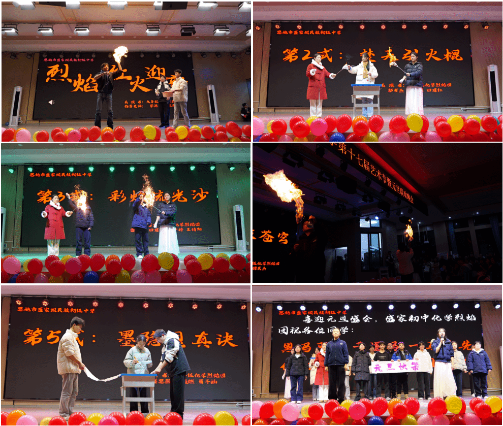 12月30日晚,恩施市盛家坝民族初级中学元旦晚会现场惊喜连连。化学实验秀《烈焰•红火迎新》首次亮相晚会,瞬间点燃了全场热情。