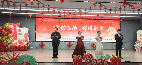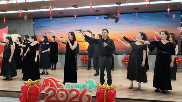 接着,精彩纷呈节目轮番上演:既有精彩的舞蹈、歌唱、情景剧表演,也有趣味十足的各类游戏,充分展示了教师们的多才多艺和团结协作的精神。《青葱岁月》、《一生有你》、《红日》、《扫尽万物,飞向宏图》、《凡人歌》、《2026年好运来来来》等舞蹈串烧,老师们以轻盈的舞姿和优美的动作,展现了别样的风采和活力。《我会等》、《路边的野花不要采》、《亲爱的你啊》等歌曲串烧,老师们用动人的旋律和欢快的演唱,传递了新年的喜悦和祝福。情景剧《直播间》用诙谐幽默的语言和真挚的情感,表达了老师们对新年的美好祝愿和对教育事业的热爱。诗朗诵《这盛世如您所愿》,老师们用动情的言语讴歌了中华民族从站起来、富起来到强起来的伟大飞跃。《阿凡提赶集》、《腰缠万贯》、《桃花朵朵开》等互动游戏为活动增添了许多欢乐和惊喜。迎新联欢活动高潮迭起,掌声不断,一场场视听盛宴给大家带来了工作上的获得感和幸福感。多彩的服装、闪烁的灯光、变幻的旋律、充满悬念的设计以及一张张充满活力的脸庞,汇成了逸群人的大舞台。