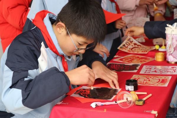 剪窗花、写福字、绘24节气竹编、趣味拓印……每个摊位前都围满了跃跃欲试的学生。墨香弥漫中,一笔一划书写的是对新春的祈愿;竹条交错间,一件件作品渐渐成型;拓印板上,传统纹样透过宣纸浮现历史的印记。动手实践的过程,不仅是精细动作的锻炼和创造力的激发,更是一场沉浸式的文化寻根之旅。