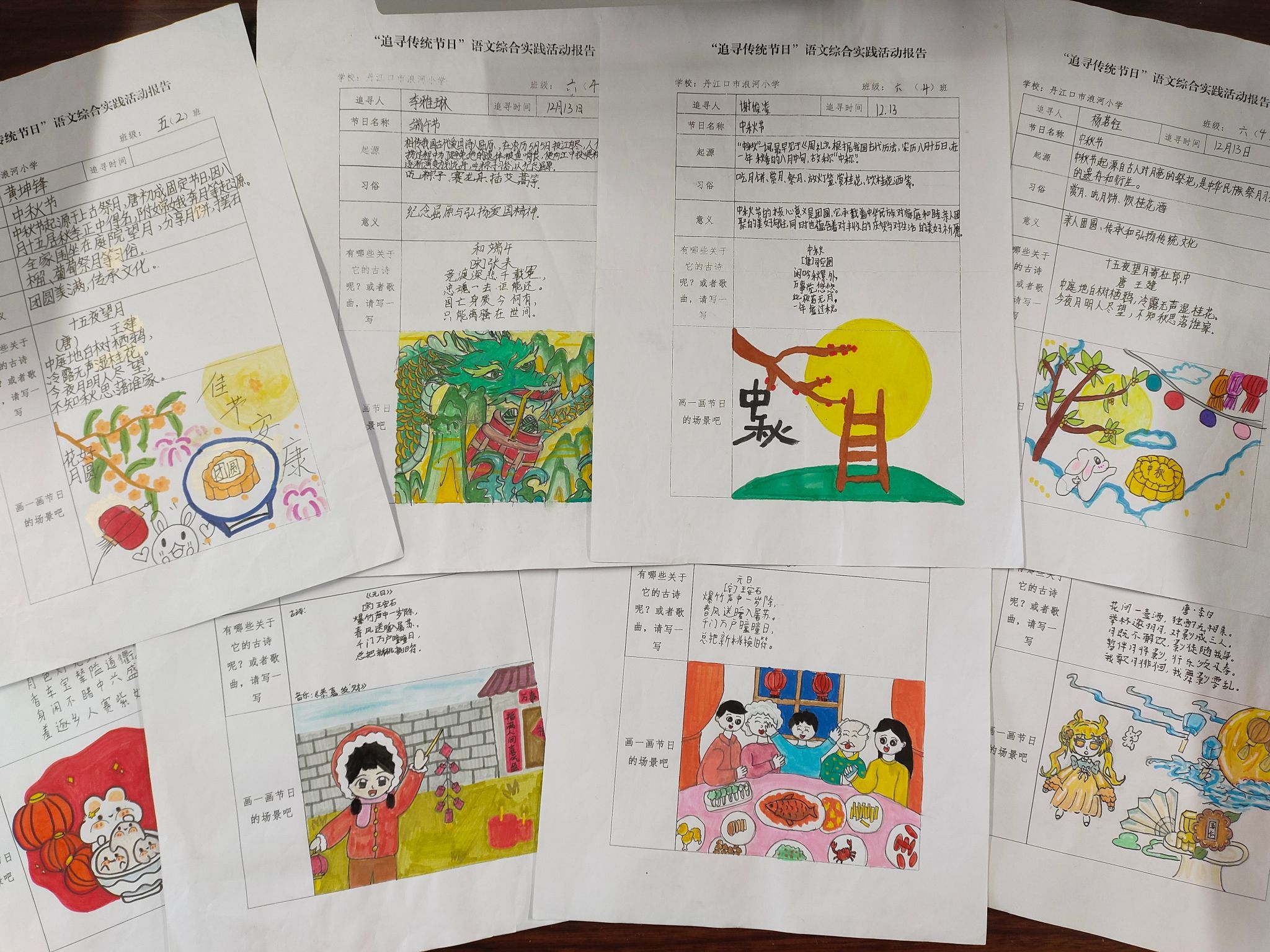 作品完善阶段,学生们充分释放创意与巧思,将探究成果转化为一幅幅鲜活生动的文化作品。他们以画笔为媒,细致勾勒出春节阖家贴春联的喜庆、元宵街头赏花灯的热闹、端午邻里包粽子的温馨、中秋全家共赏月的祥和,部分作品还搭配了简洁优美的文字注解,或引经据典、或抒发感悟,让节日场景更具感染力与文化底蕴。与此同时,大家逐字核对活动报告单内容,力求信息准确完整、字迹工整规范,将满满的探究收获与文化热爱,凝结在一张张精心打磨的报告之中。