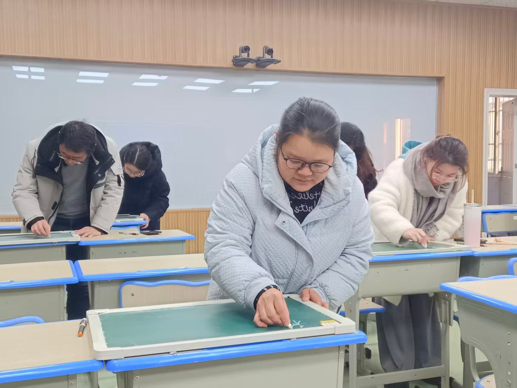 考核现场,氛围专注而热烈。教师们全神贯注,凝心聚神于笔尖毫末。一方素纸,一支硬笔,勾勒出结构严谨、端庄清秀的楷书章法;一块黑板,几根粉笔,流淌出行云流水、疏密得宜的板书韵律。点横撇捺间,展现的是扎实的书写功底;提按转折处,蕴含的是严谨的治学态度。笔墨挥洒不仅是对技能的展示,更是对教育初心与匠心的生动诠释。