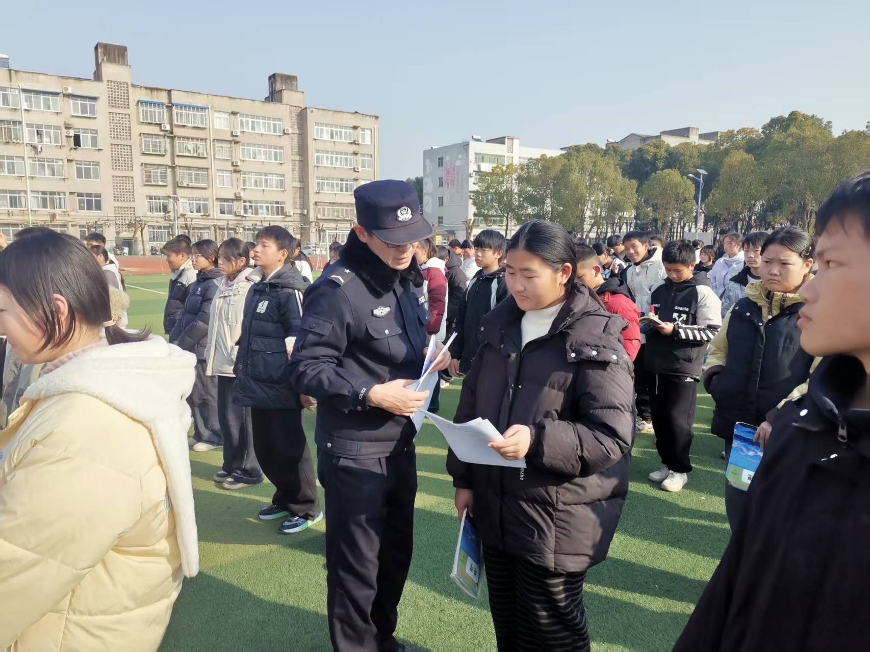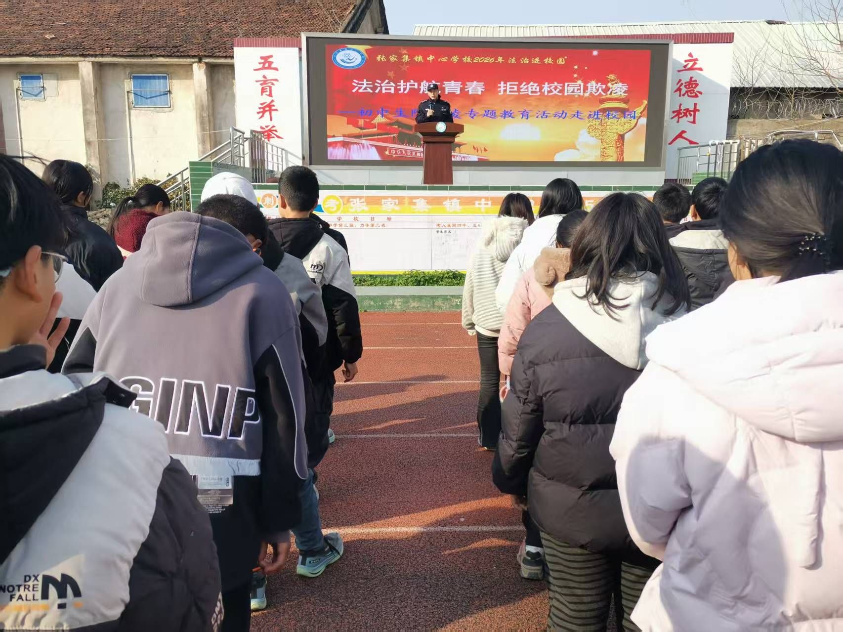 为筑牢校园安全防线,增强初中生法治意识与自我保护能力,元月16日,张家集镇派出所、司法所、综治办联合张家集镇中心学校开展“法治进校园·防欺凌护成长”专题教育活动,为全校700余名初中生送上一堂兼具实用性与警示性的法治必修课。活动通过案例剖析、情景模拟、互动问答等多元形式,让反欺凌理念深植学生心中,织密校园安全防护网。