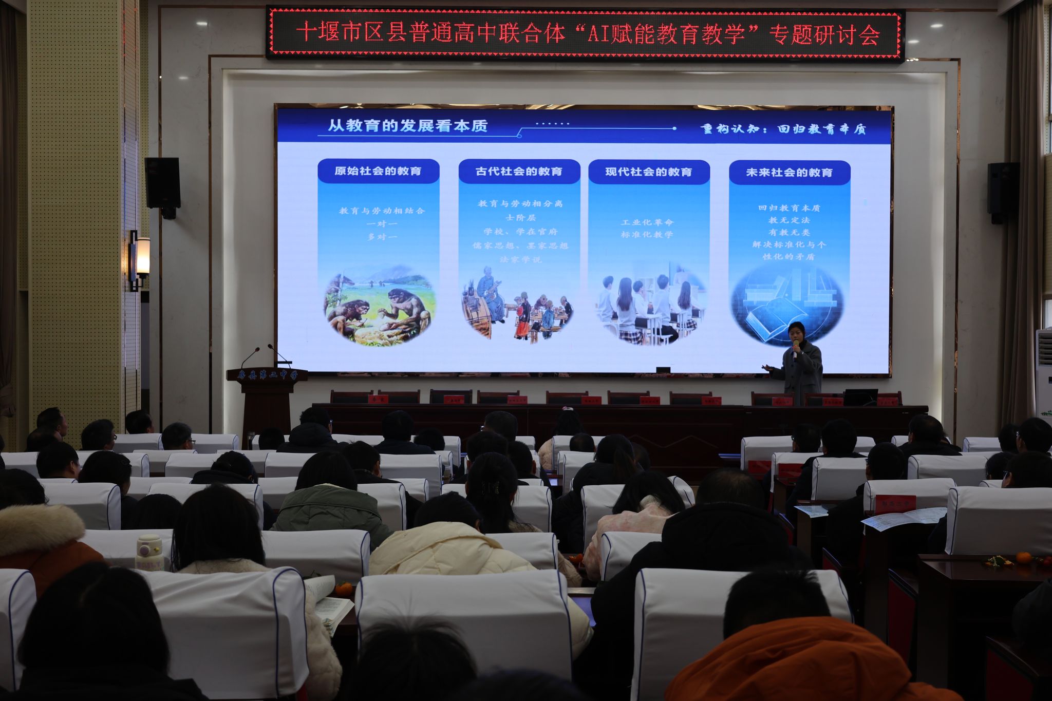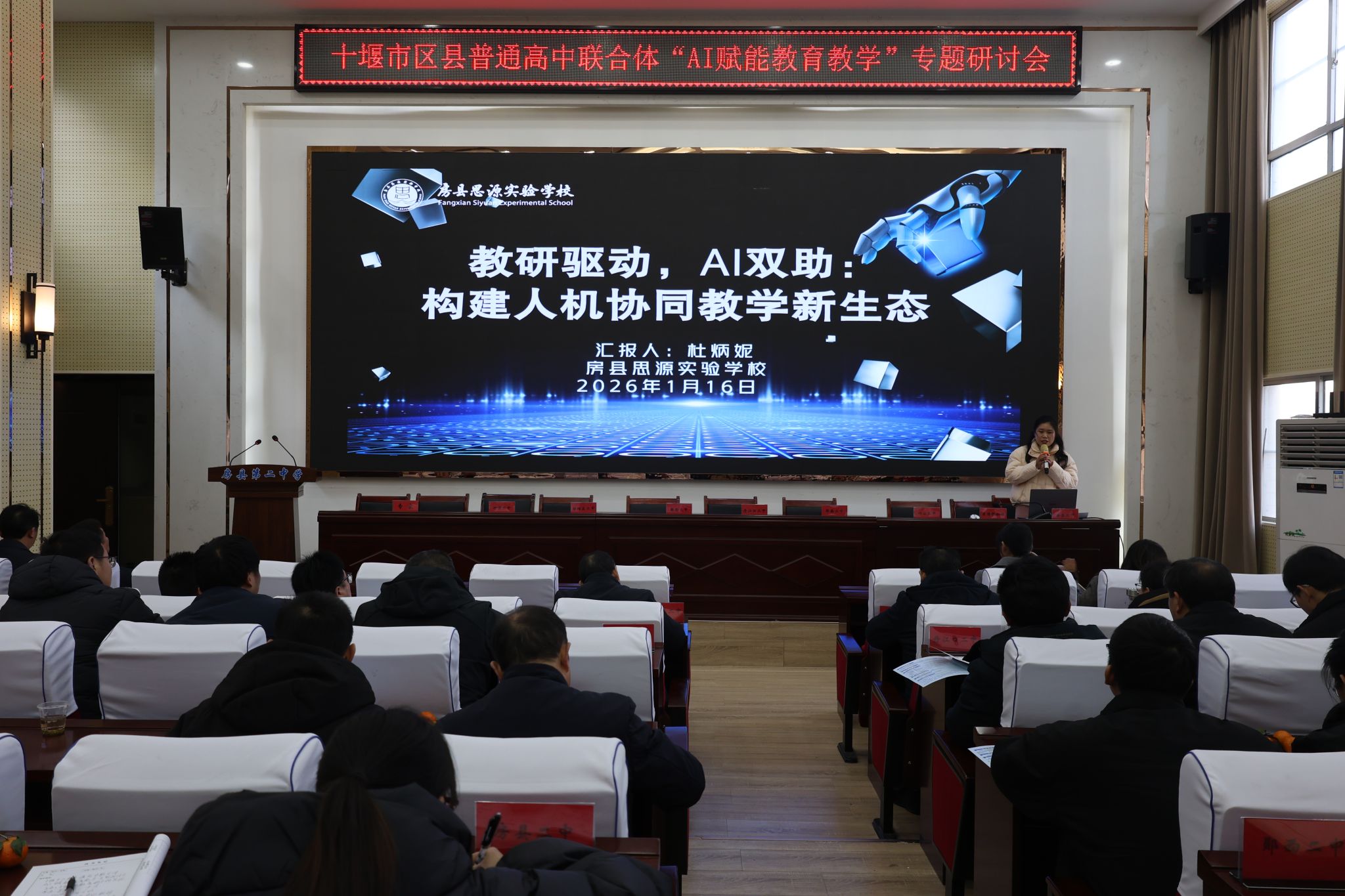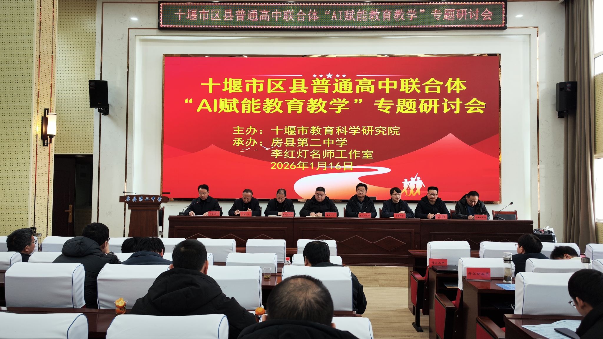 为深化人工智能技术在教育教学领域的融合应用,搭建校际交流合作平台,探索智能化教学创新路径,提升区域教育整体质量与创新能力,1月16日,“拥抱AI变革,智启教育未来”十堰市区县普通高中联合体AI赋能教育教学专题研讨会在房县二中隆重举行,联合体六县(市、区)成员学校负责人及骨干教师代表齐聚一堂,围绕人工智能与高中教育教学的深度融合展开交流,共同探索智能化教学新路径。会议由房县二中副校长李红灯主持,房县二中党总支书记胡衍庆致欢迎词。