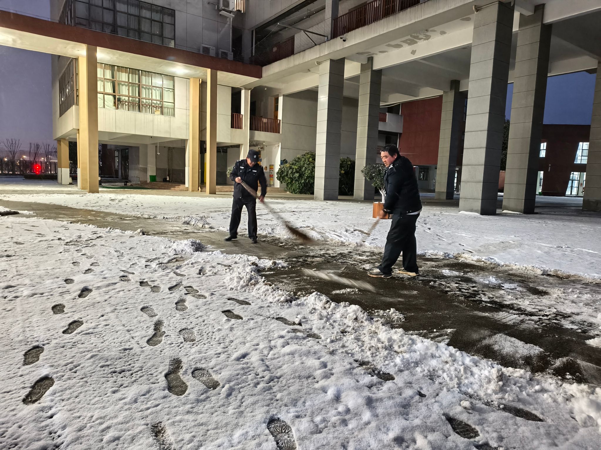 天色尚未完全放亮,校园还笼罩在雪后的宁静之中,除雪队伍已全员到岗。校领导班子率先行动,手持铁锹、扫帚,一边巡查各主干道和楼梯通道的积雪情况,一边现场参与清扫,以实际行动传递着“学生安全无小事”的责任担当。保安队员们推着沉重的铲雪车,在宿舍到教学楼、食堂的主要通道上奋力开道;后勤员工细致清扫着走廊、台阶和转角处的残雪冰渣;留校教师们纷纷加入,在每栋宿舍楼出口、每段连接廊桥处认真清理,不放过任何一处可能滑倒的角落。寒风中,铲雪声、扫雪声与互相鼓励的交谈声交织在一起,形成了一幅温暖而有力的冬日清晨画面。
