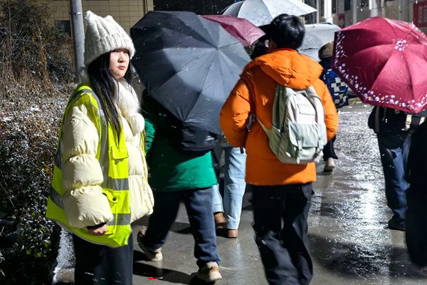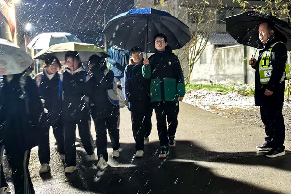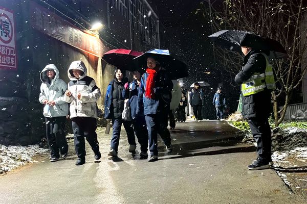 “慢点走,注意脚下!”“小心路滑!”一声声殷切的叮嘱穿透风雪,温暖着孩子们心。老师们细心观察路况,适时提醒学生避开积雪湿滑区域,引导他们有序安全离校。寒风扑面,雪花落肩,但老师们守护的目光始终未曾离开学生。那一片片跃动的“荧光绿”,宛如黑夜中的平安灯,照亮了学子们的归家路,也驱散了风雪夜的寒意。