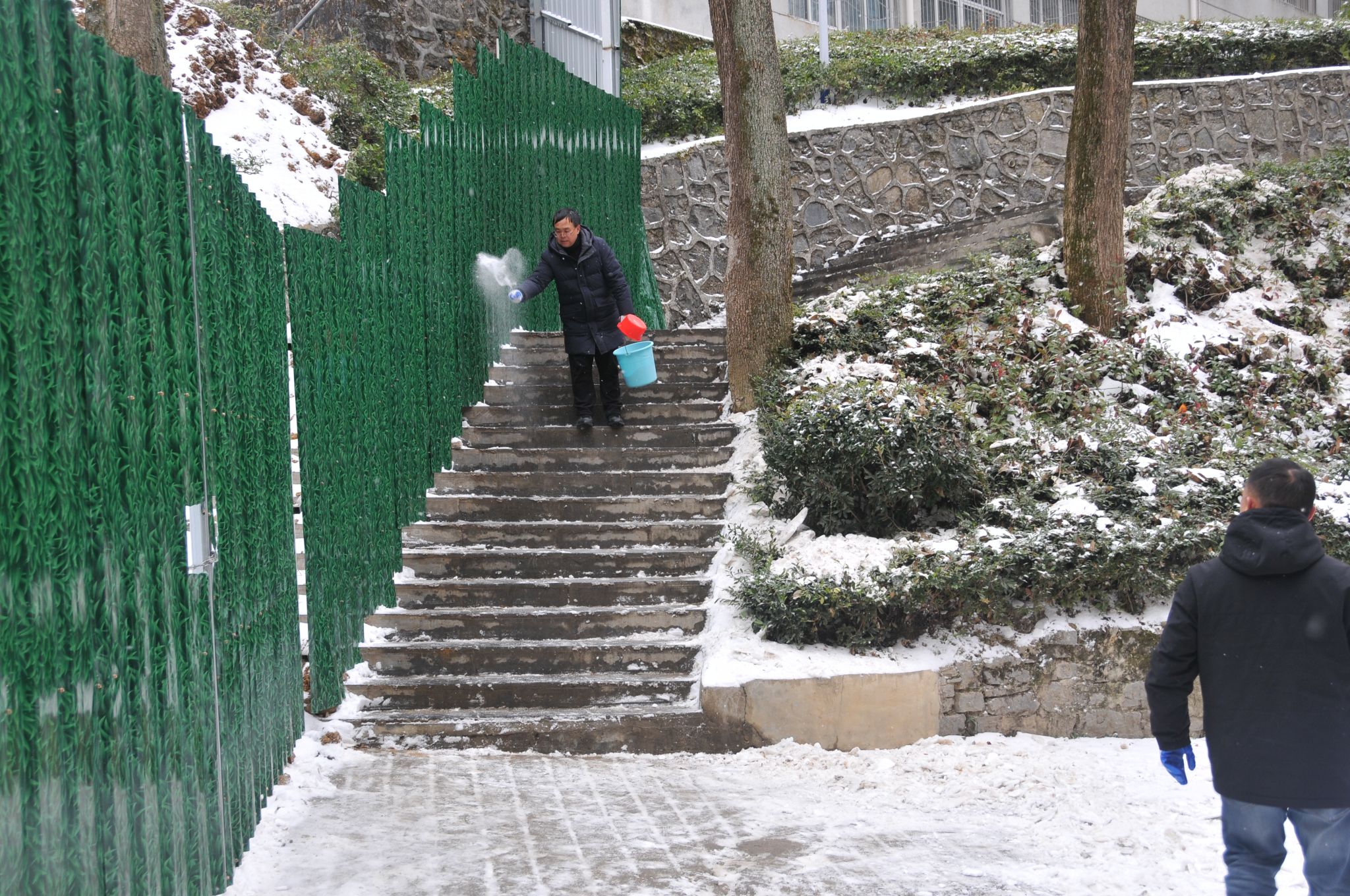 在严寒中,校领导班子成员和党员教师身先士卒,挥动铁锹破除冰层;大家分工明确,有的负责铲雪,有的负责清运,有的铺设防滑垫。后勤部门同步调配融雪剂,对坡道、转弯处等易滑区域进行重点处理。经过二个多小时清扫,校园内主要通道、连廊全部清理完毕。