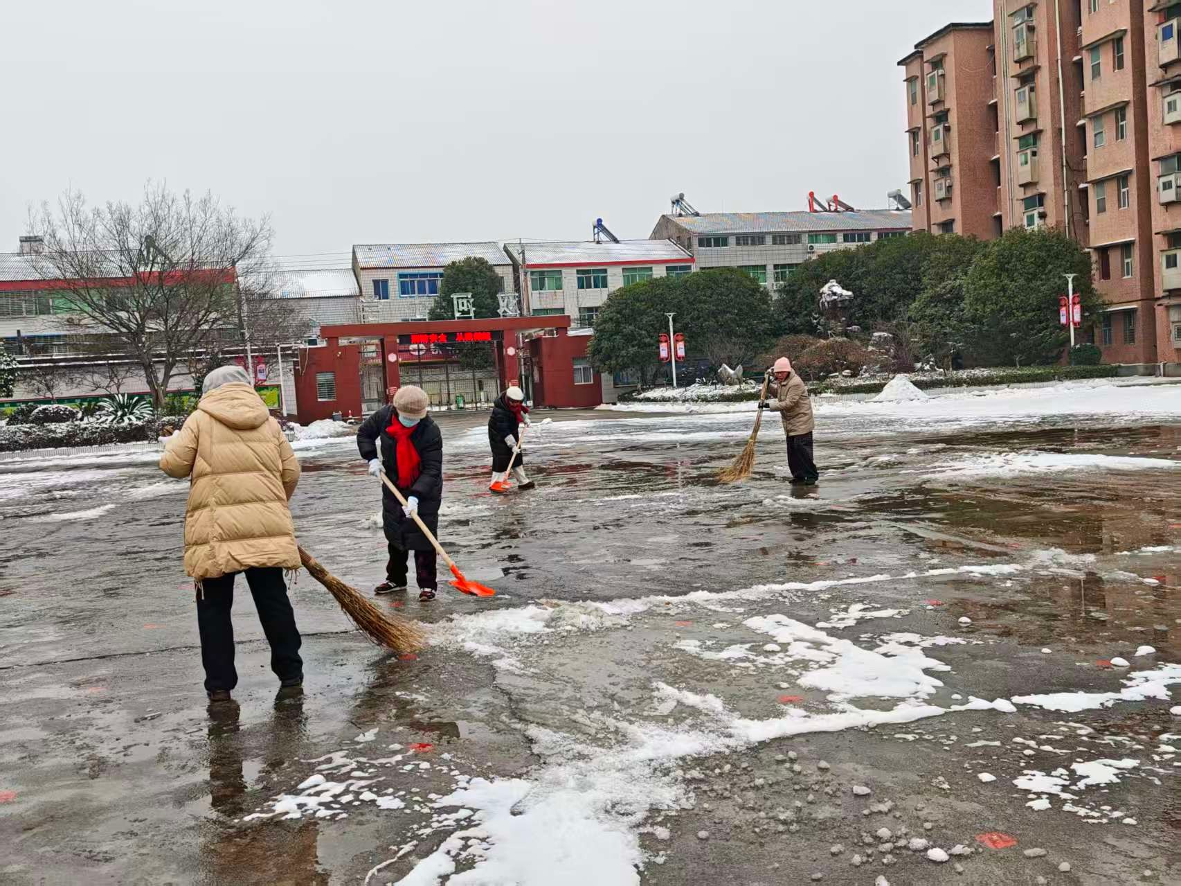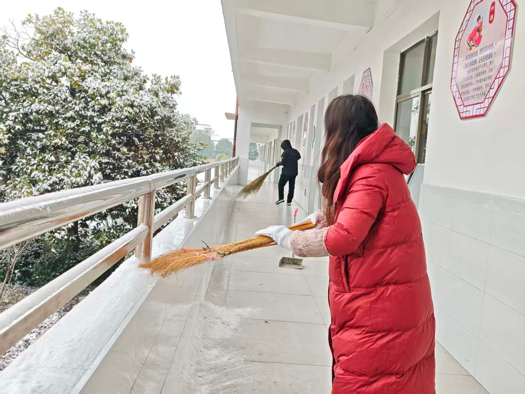 停课不停责,关爱不缺位。为尽快消除积雪隐患,保障学生早日安全返校,学校当日清晨发出扫雪倡议,家住附近可步行抵达的教师积极响应,自带铁锹、扫帚等工具赶赴校园。尽管室外气温跌破零度,老师们不畏严寒、分工协作:年轻教师奋力铲雪堆,年长教师细致扫残冰,行政后勤人员重点清理教学楼出入口、校门口等关键区域,现场热火朝天。