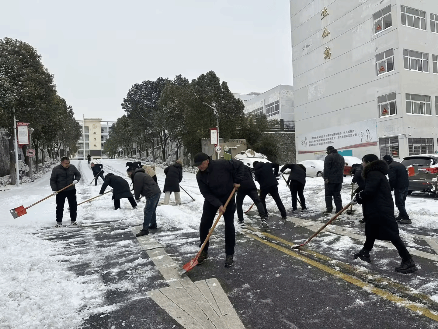 一声令下,闻令而动。班子成员、领导干部率先垂范,冲锋在前;党员干部和老师们积极响应,踊跃参与。凛冽寒风中,大家手持铁锹、扫帚,齐心协力铲积雪、除坚冰,干劲十足。面对局部厚度达10公分的积雪和湿滑结冰的路面,没有一人退缩,没有一句怨言。短短两个小时,大家累计清理积雪面积超1000平方米,校内主路等主路的积雪已基本清理完毕,为校园安全打通了关键通道。