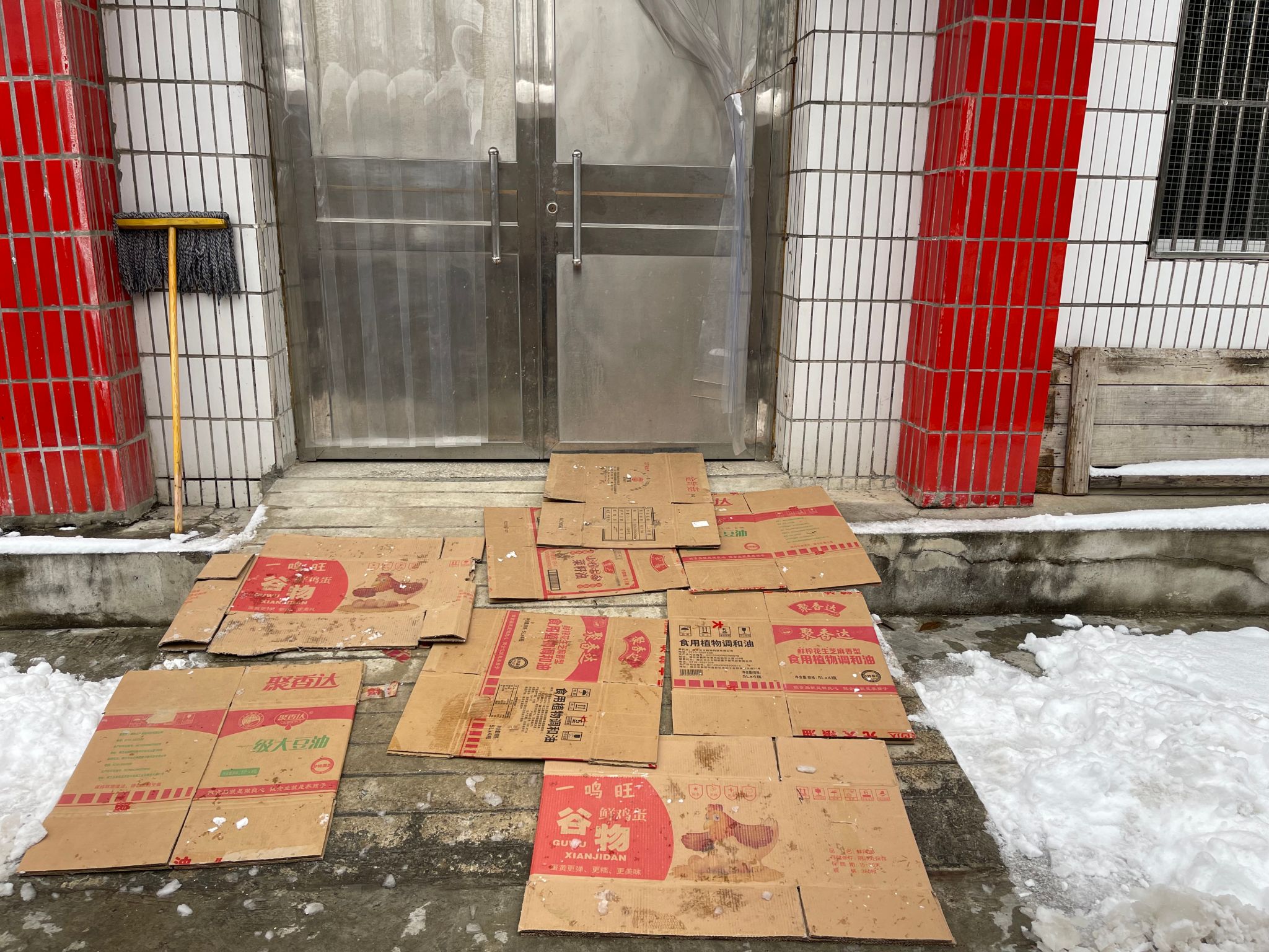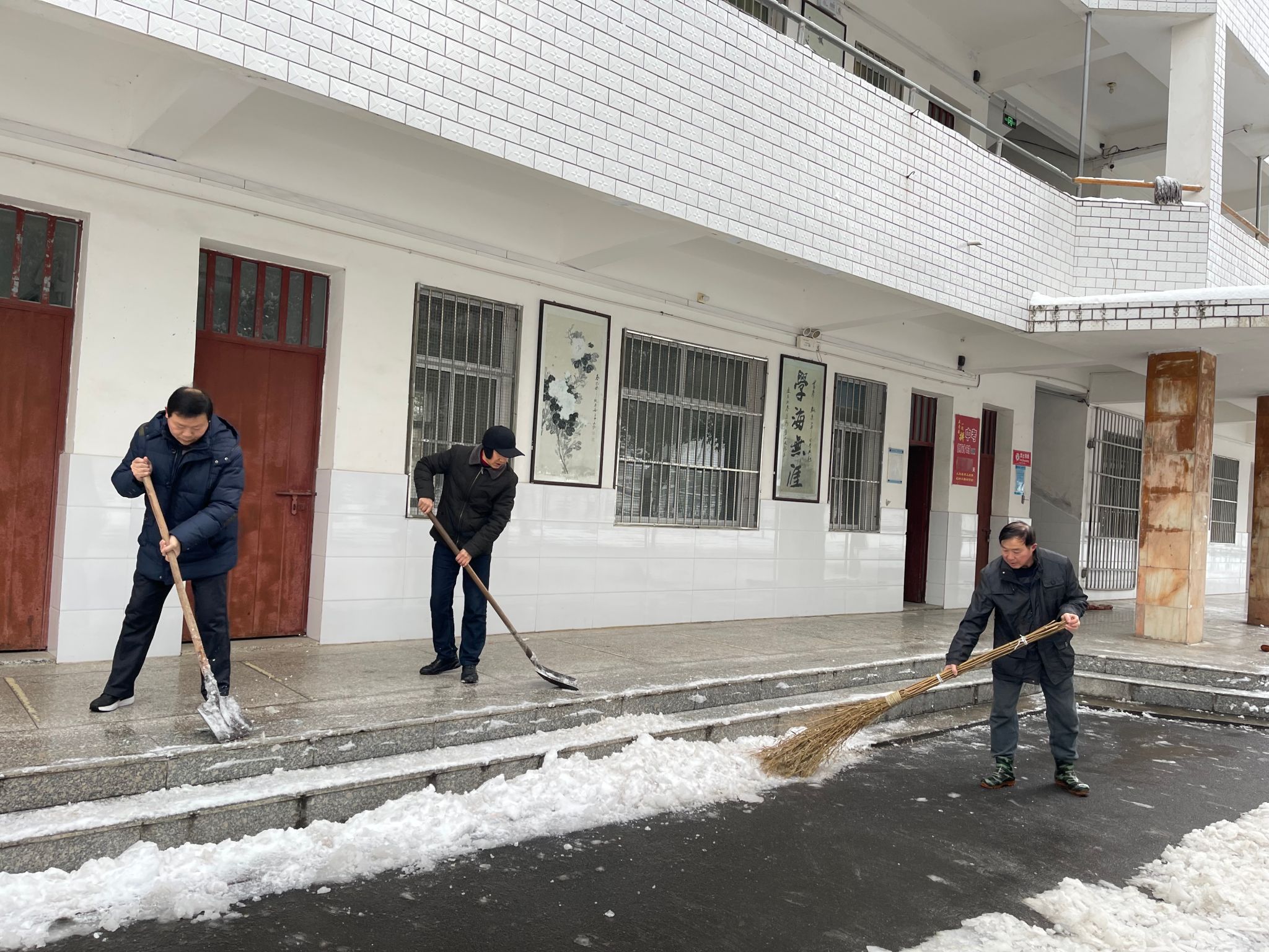 经过一个多小时的奋战,校门口至教学楼、师生寝室至教学楼、教学楼至厕所、教学楼至餐厅四条核心通行线路全部被打通。为最大程度消除防滑隐患,学校还贴心地在各楼宇门口铺设防滑纸箱与旧沙发垫,织密校园安全防护网。