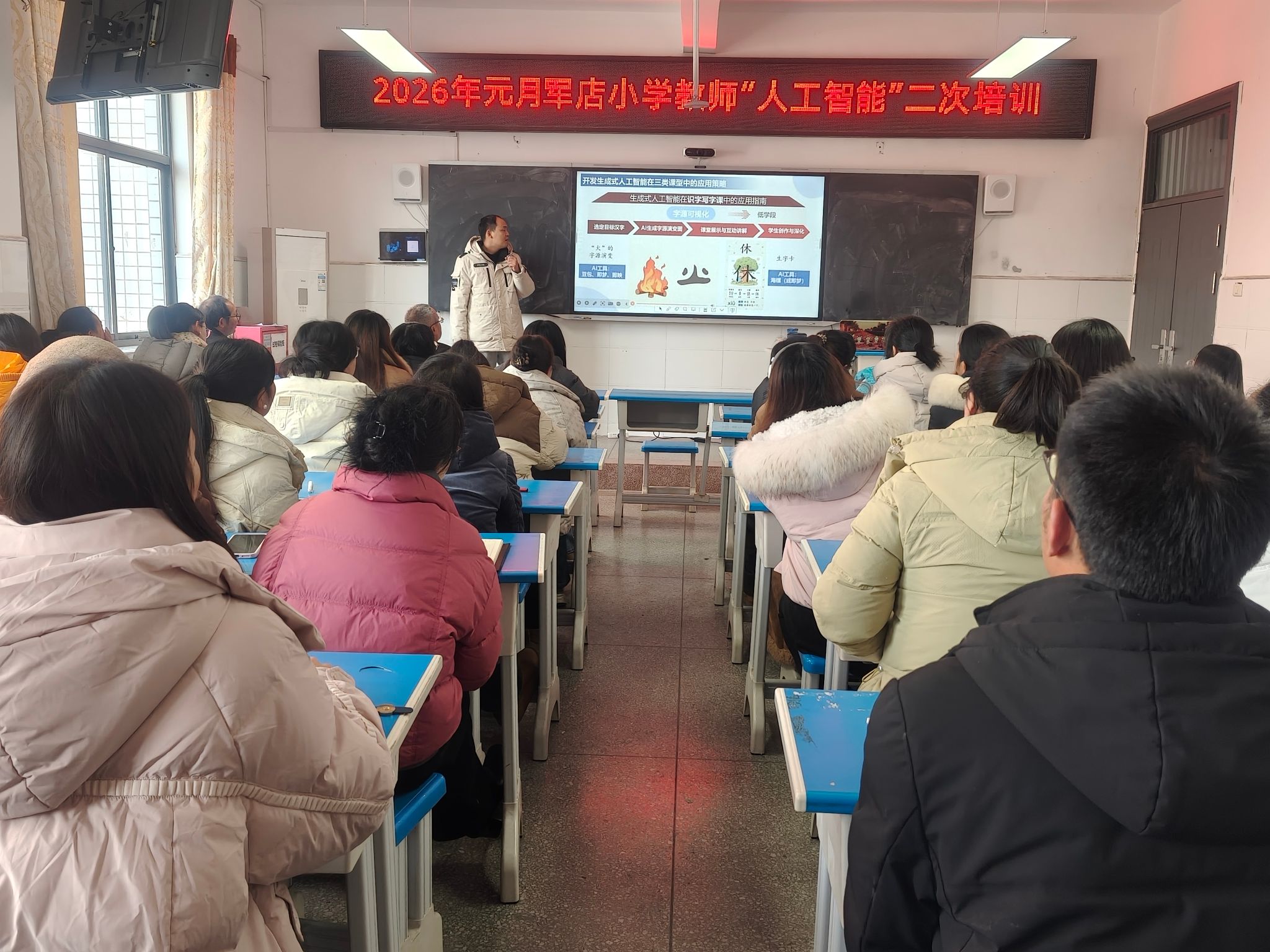 为深入推进教育数字化转型,充分发挥人工智能教育试点校的示范引领作用,切实转化外出培训学习成果,推动学校人工智能教育工作规范化、高质量开展,1月26日,军店小学在“三个课堂”教室举行教师人工智能二次培训活动,全体教师齐聚一堂,共赴这场AI教育赋能之旅。
