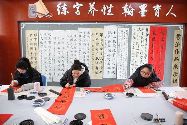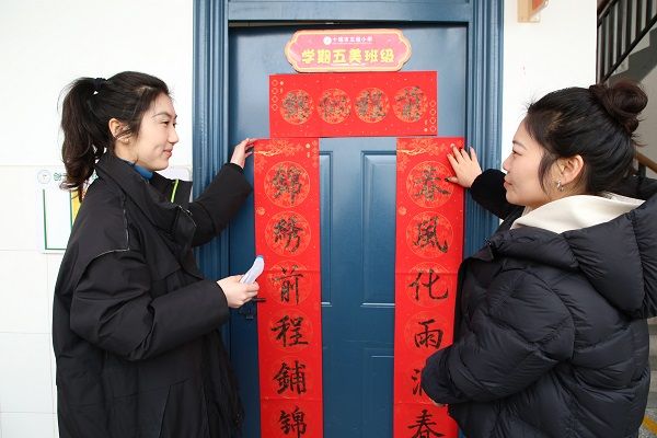写好的春联由老师们亲手张贴在办公室门口。红纸黛墨,相映生辉,书法艺术浸润的文化氛围,成为校园一道亮丽的风景。