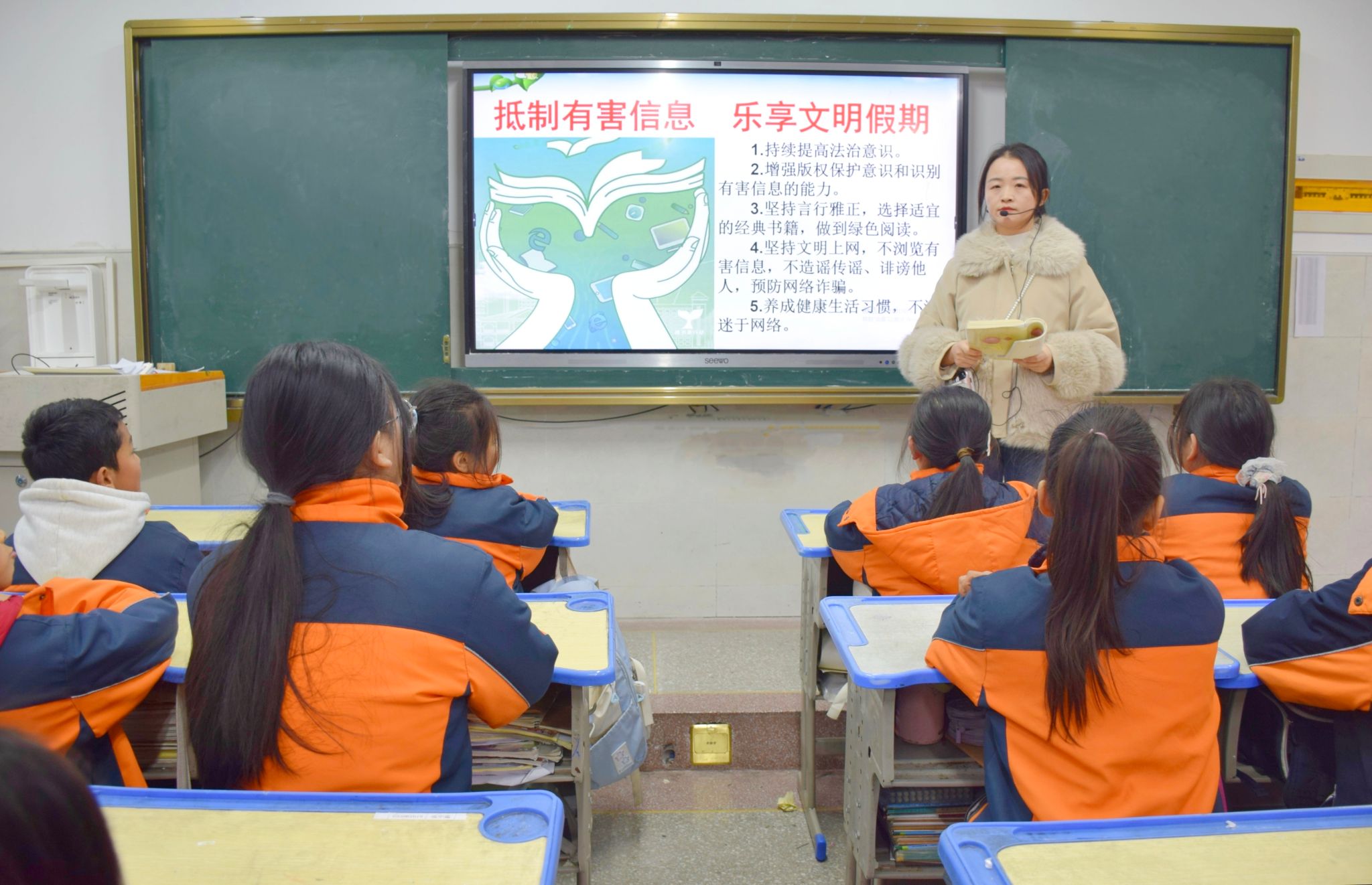 “同学们要保持高度的法治意识,掌握运用相关技能,自觉抵制不良信息,做到绿色阅读,坚持文明上网,保持良好的生活习惯,适度参加户外体育运动,让身心都能在假期里阳光成长……”1月27日,郧阳区献珍学校教师孙丽对学生这样要求道。