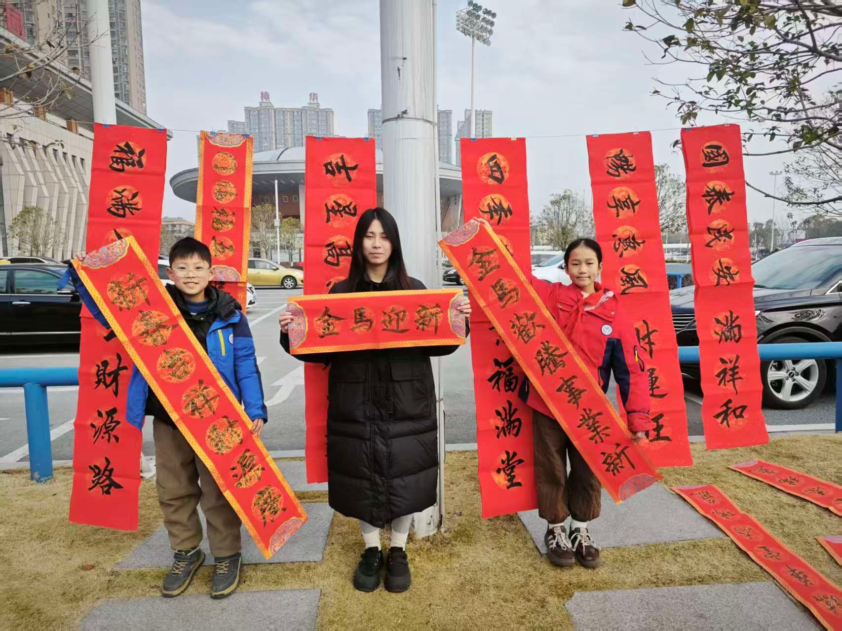 2月4日,潜江市体育广场墨香萦绕、暖意融融。潜江市开放大学张宗寿书法创新工作室携手园林第五小学,共同举办“书春联·送祝福”活动。11位书法名家与12名“小书法家”同台挥毫,将美好的新春祝愿化作一副副春联、一张张“福”字,免费赠予过往市民,为即将到来的春节增添了浓厚的文化气息。