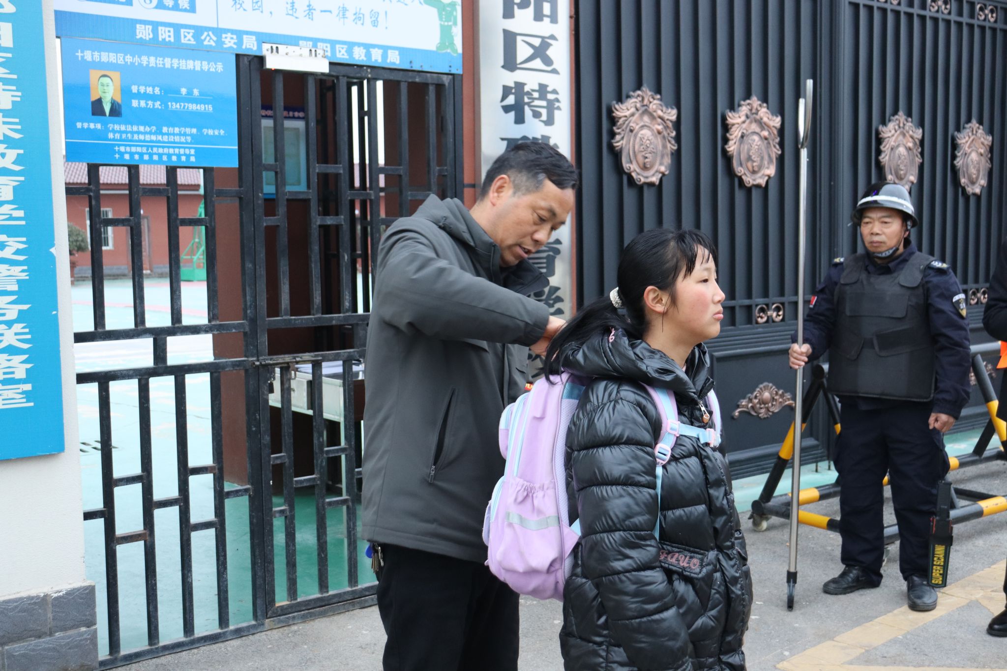3月4日,农历正月十六,清晨7:30,郧阳区特校校门口,值日领导、值日教师、护校队成员佩戴醒目袖章,手持防护器械,与郧阳区城东公安分局的民警一起维持秩序,迎接新学期的第一批学生。校园内,广播里播放着轻快的音乐,电子显示屏上滚动着“欢迎同学们返校”的温馨话语,沉寂了一个寒假的校园重新焕发出生机与活力。