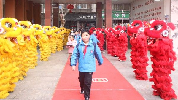 清晨8时,校园内锣鼓喧天、喜气洋溢,处处涌动着新学期的生机与活力。威武灵动的舞狮表演精彩开场,灵动的身姿、欢快的节奏,喜迎学子重返校园、开启新程。蜿蜒的红毯铺就“逐光之路”,寓意学子们在新的一年向阳生长;“光韵幸福树”迎风摇曳,承载着师生对新学期的美好期许。各班级精心布置迎新环境,黑板上“龙马精神启新程,向阳逐光向未来”“新学期,新起点,新成长”“欢迎同学们回家,向着美好出发”等暖心寄语,让每一位返校学子都能感受到浓浓的归属感与仪式感,快速融入校园氛围。