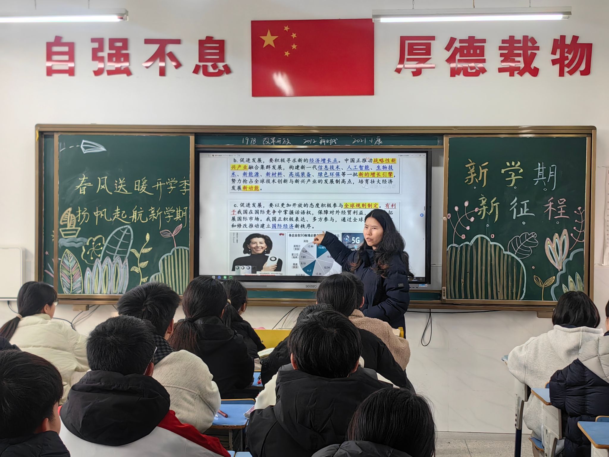 上课铃声响起,教学楼里传来久违的读书声与授课声。走进教室,老师们正在开展新学期的“开学第一课”。黑板上,“新学期 新目标”的板书格外醒目。老师们或结合寒假热点话题激发学生思考,或立足学科特点讲解新学期知识框架,或围绕班风学风建设提出具体要求。讲台上,老师们语重心长,引导学生尽快调整作息,收心归位;讲台下,同学们坐姿端正,目光专注,以饱满的精神状态迎接新学期的挑战。老师们温暖而有力的话语,如春风化雨,浸润着每一位学子的心田。