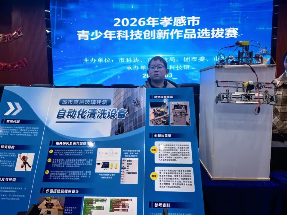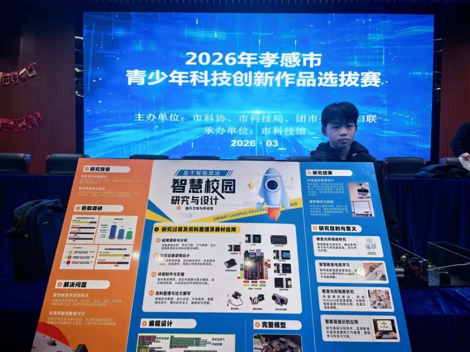 2026年3月2日,2026年孝感市青少年科技创新作品选拔赛在孝感市科技馆科学剧场举行。汉川市选派汉川外国语学校李钎玥、刘允恒、吴子睿三名学子携三项原创发明亮相赛场,以扎实科创素养与亮眼作品,展现汉川青少年创新风采。