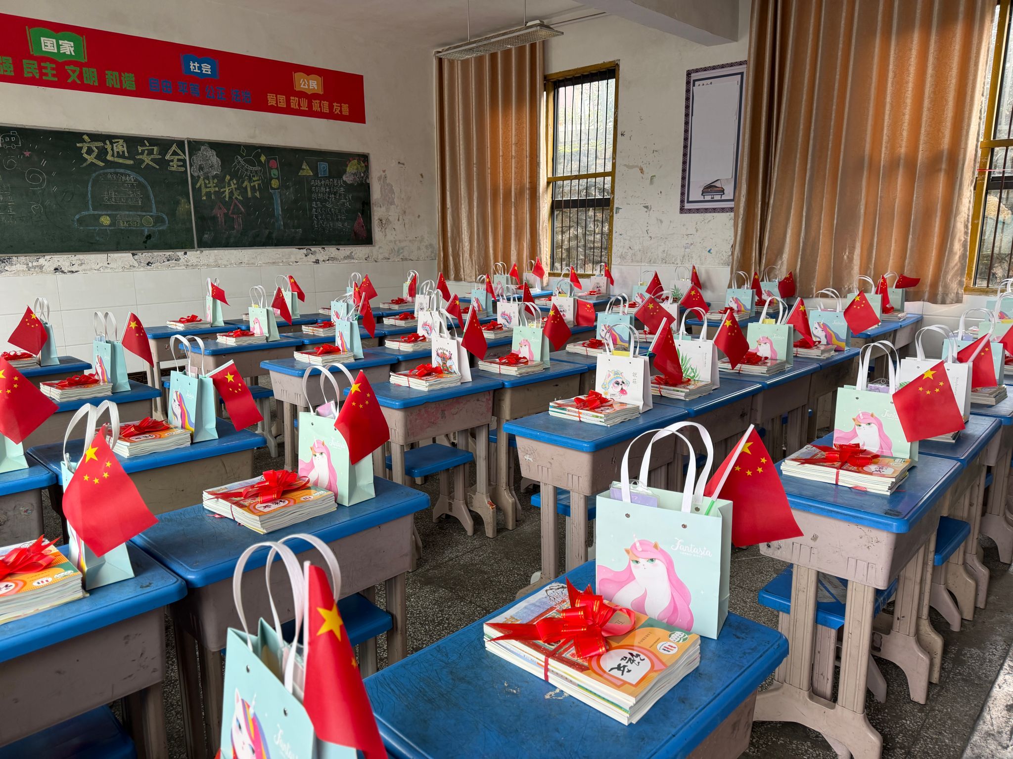为了让孩子们感受到新学期的温暖与期待,学校提前对校园进行了精心布置。在教室里,老师们将崭新的课本用红丝带细心系好,整齐摆放在课桌上,同时准备了印有可爱图案的开学礼袋,搭配鲜艳的小国旗,让每一个座位都充满惊喜。黑板上,“新学期 再出发”“马力全开 共赴新程”等充满活力的粉笔字,搭配手绘的烟花图案,传递着对新学期的美好期许。