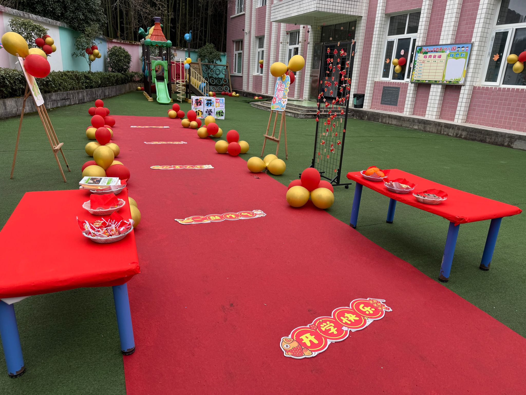 校园里,幼儿园的老师们更是用心打造了一条喜庆的“开学红毯”。红毯两侧,红金相间的气球错落有致,地面上贴着“开学快乐”“一鼓作气”等趣味地贴,旁边的小桌上摆放着糖果和水果,让孩子们在踏入校园的第一步,就被浓浓的仪式感和幸福感包围。