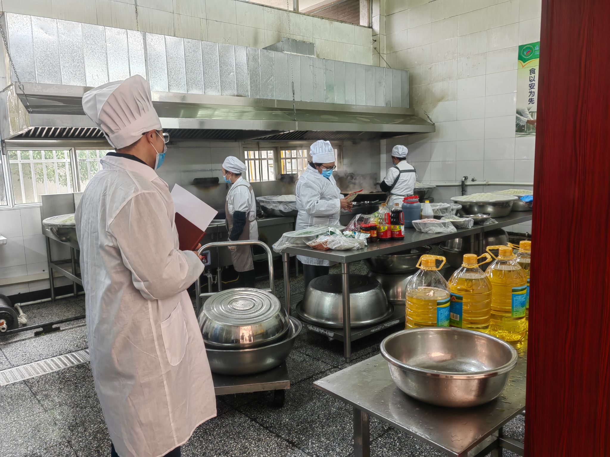 当天上午,学校食品安全总监、膳食委员会代表及家长代表在食堂负责人的引导下,穿戴好防护装备,深入食堂库房、操作间、消毒间、留样间等功能区域,全面了解食材采购、验收、储存、加工、留样等环节的规范化流程,实地察看“明厨亮灶”及“1+4数字食堂”综合监管平台运行情况。家长们现场观摩了食堂工作人员的规范操作,仔细查验食材新鲜度,核对库房食品保质期,从源头严把食品安全关。