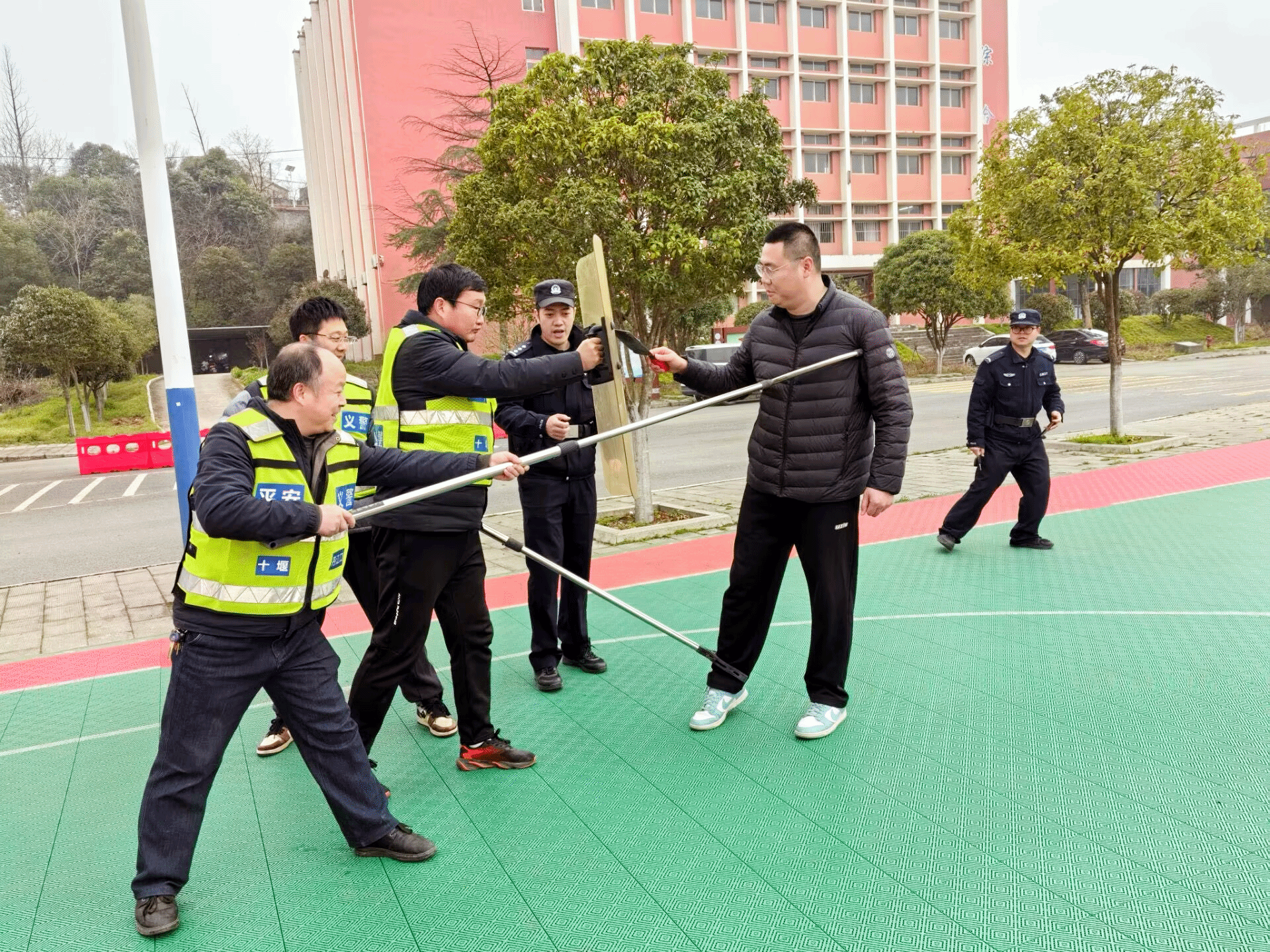 演练结束后,浪河派出所副所长陈晨现场开展防暴器材使用专题培训,重点讲解防暴盾牌、钢叉、橡胶警棍、防割手套等装备的功能特点、操作规范与协同战术,示范“三角合围、盾叉配合”等实用技巧,逐一纠正动作细节,确保参训人员懂操作、会使用、能协同。培训强调,最小应急单元要做到1分钟响应、3分钟处置、5分钟增援,切实守好校园安全“第一道防线”。