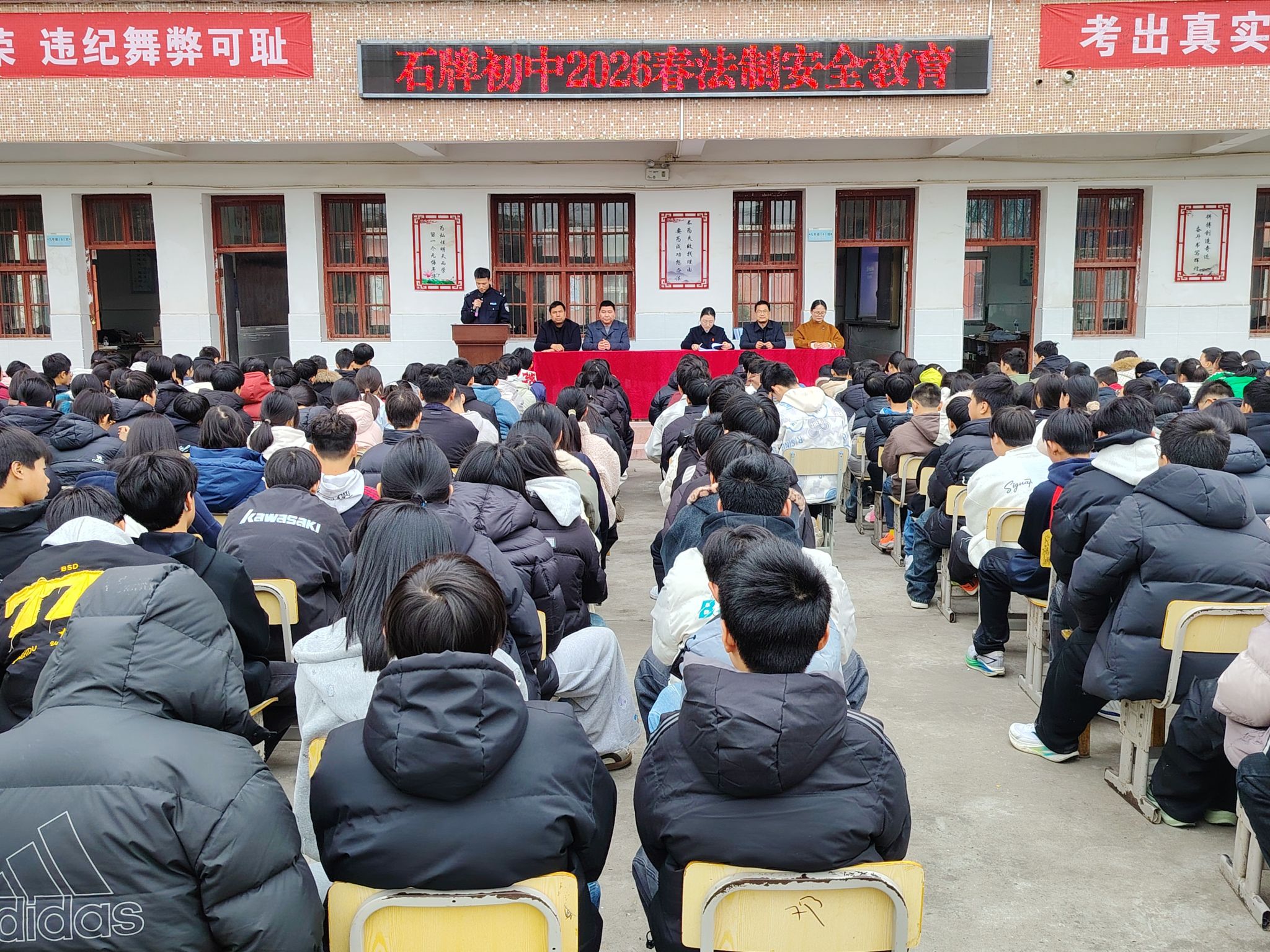 为增强青少年法治观念,筑牢校园安全防线,3月4日,石牌初中特邀镇派出所陈警官与钟祥市人民法院谢法官走进校园,为全校师生带来了一堂生动的法治安全教育课。