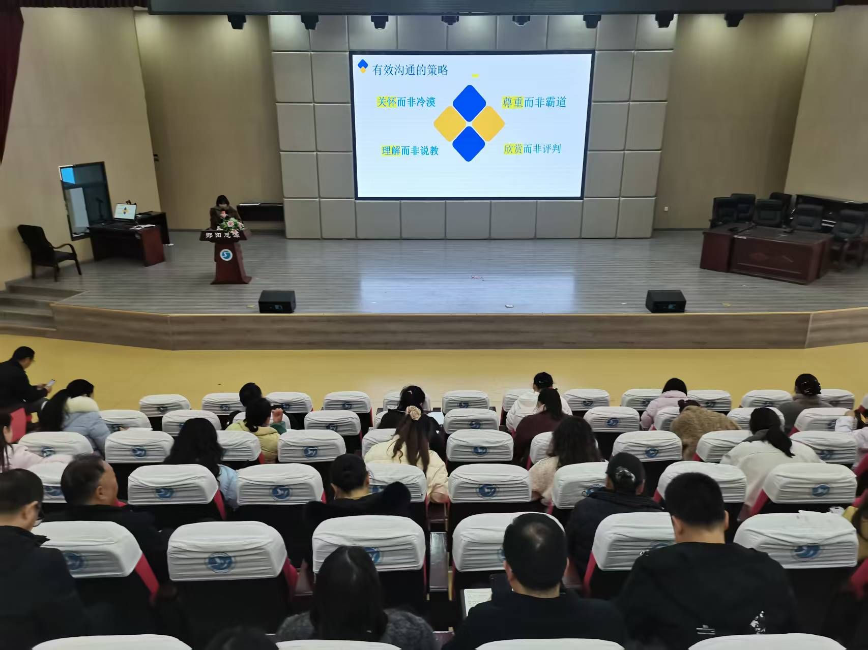 本次培训由学校心理健康教育教师袁立娜主讲,她以“看见学生 看见成长”为主题,结合春季开学后学生的心理特点,分析了学生情绪波动大、适应节奏不一等共性状态。她围绕有效沟通、积极倾听等核心内容展开讲解,提出了尊重、欣赏的沟通策略,详解积极倾听技巧与“识别--接纳--表达理解”的共情三层次方法,还介绍了“肯定+建议+鼓励”的“三明治”表达法,让教育引导更易被学生接受她明确关怀学生的三大原则,结合实际场景分享传递关怀的细节方法,并针对家校沟通给出“先共情再沟通、用‘我们’代替‘你’ 的协作技巧,助力形成心育合力。