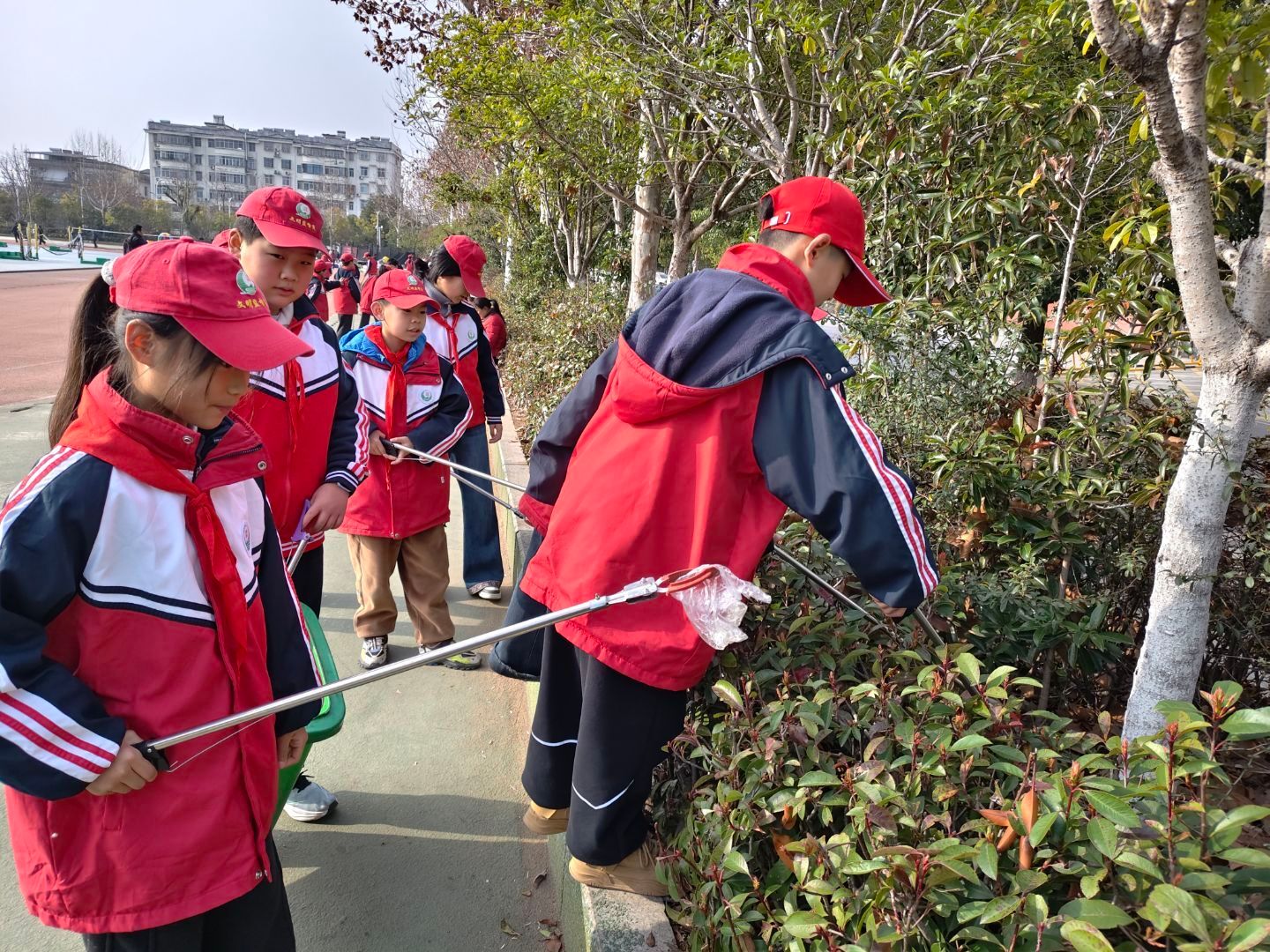 活动现场,队员们迅速行动,手持扫帚、簸箕、垃圾夹等清洁工具,分工合作、默契配合,对体育场广场路面、健身区、绿化带进行全面清理,认真捡拾纸屑、塑料袋、杂草,不放过任何一个卫生死角。微凉的春风挡不住孩子们的热情,小小的身影忙碌穿梭,不怕脏、不怕累,用实际行动美化家园、践行雷锋精神。