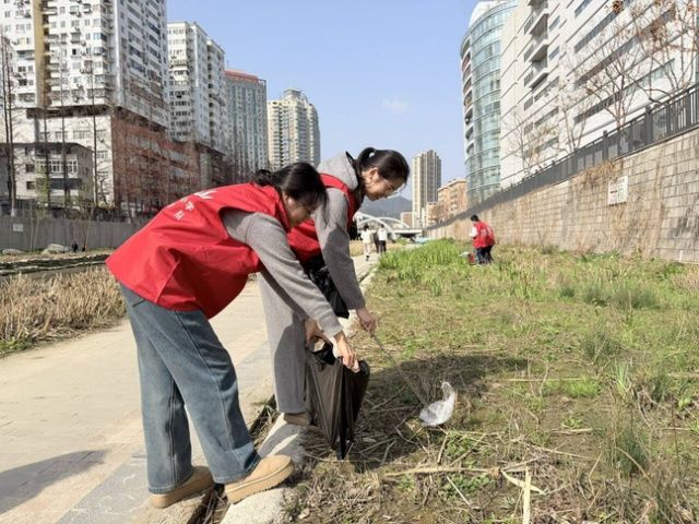下午时分,由实验小学副校长李胜东、团员教师及少先队员代表组成的20人志愿服务队在校门口准时集结。他们身着醒目的红色志愿马甲,手持垃圾袋、垃圾夹、扫把、撮箕等劳动工具,精神抖擞地来到校园周边的百二河区域,对百二河人行河道及周边区域进行了细致的“地毯式”清理。活动中,志愿者们发扬不怕脏、不怕累的优良作风,无论是路面上的烟头、纸屑,还是隐藏在绿化带深处的塑料瓶、包装袋,都被一一捡起,分类装入垃圾袋。红色的志愿马甲在春日的河岸边跳动,形成了一道亮丽的风景线。