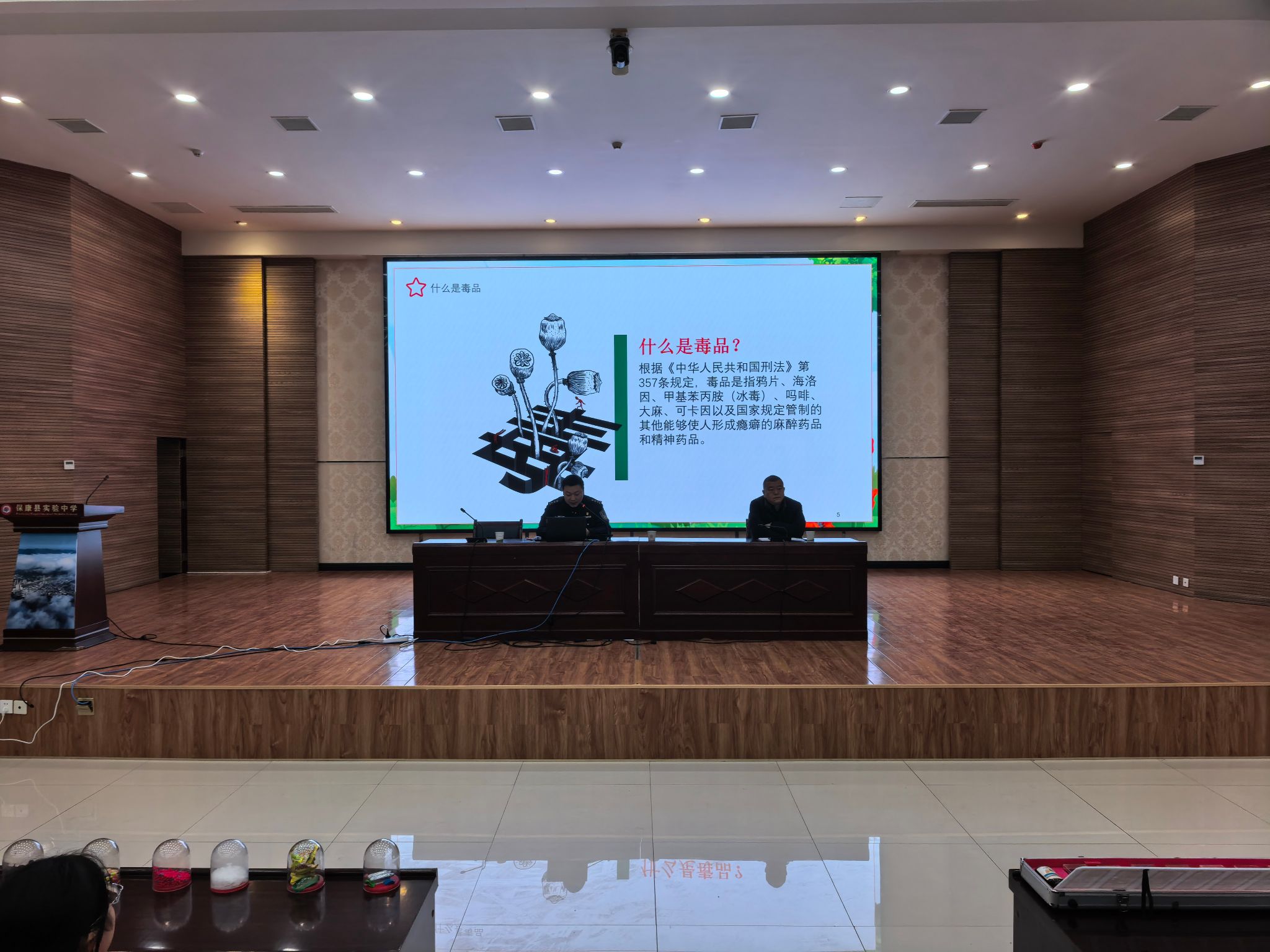 活动第二部分为“拒绝毒惑”。由毒禁县大队警官,科普新型毒品(如依托咪酯等)的伪装性与危害,讲解如何识别毒品、远离毒品陷阱,展示仿真毒品模型。