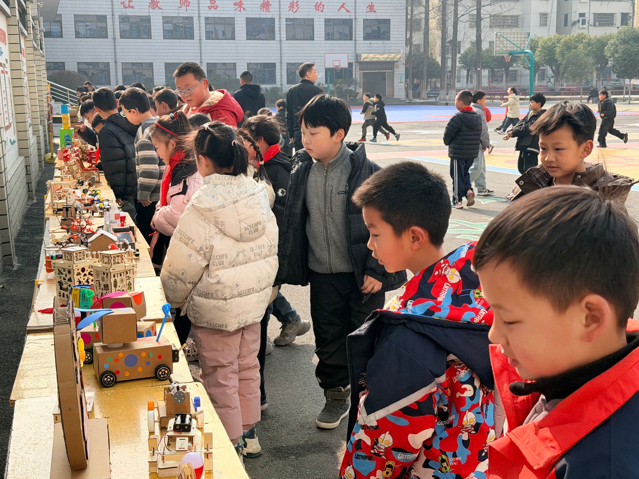 科技小制作展区尽显创意。学生们利用废旧纸盒、塑料瓶、电池等材料,制作出风力小船、太阳能走马灯、马年主题机器人、简易压水井、自动泡泡机等作品 。每件作品都附有创作说明,清晰标注设计思路与科学原理。孩子们现场演示作品功能,讲解制作过程,展现出极强的动手能力和创新思维。