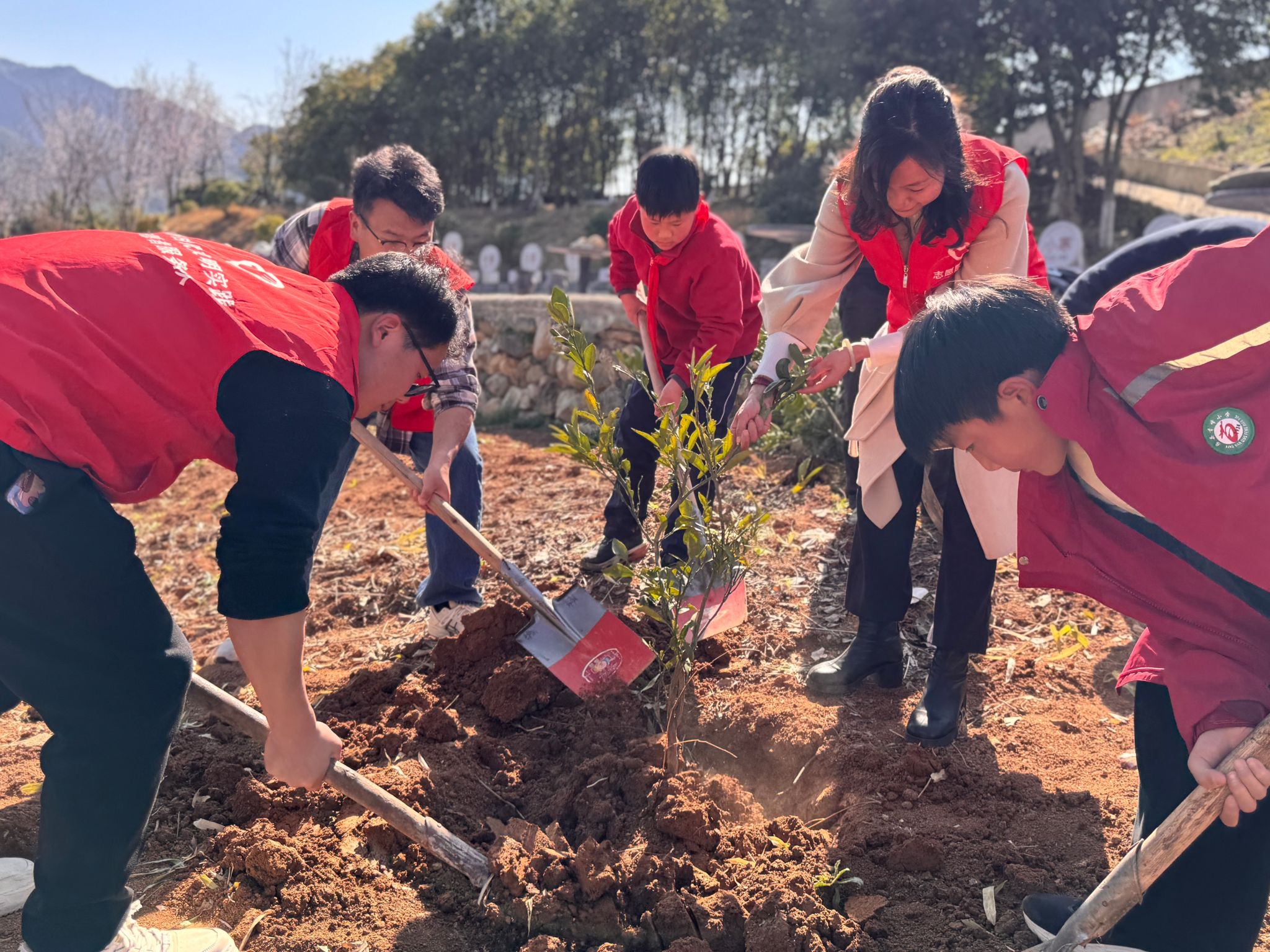 活动现场,师生们热情高涨。五年级的几个男生主动承包了最费力的挖坑任务,他们轮番上阵,挥锹铲土,额头渗出汗珠也不肯休息;低年级学生在老师手把手的指导下,小心翼翼地扶正橘苗,生怕碰断了嫩根。“坑要挖得深一些,土要踩得实一点……”六年级的“劳动小能手”一边示范一边叮嘱身边的同学。浇水环节更是热闹,孩子们拎着小桶往返于水龙头和树坑之间,有的蹲下身子仔细观察水慢慢渗入泥土,有的伸手轻轻拨开叶片检查是否浇透。一株株橘树苗在师生们的精心栽种下,稳稳扎根、迎风挺立。