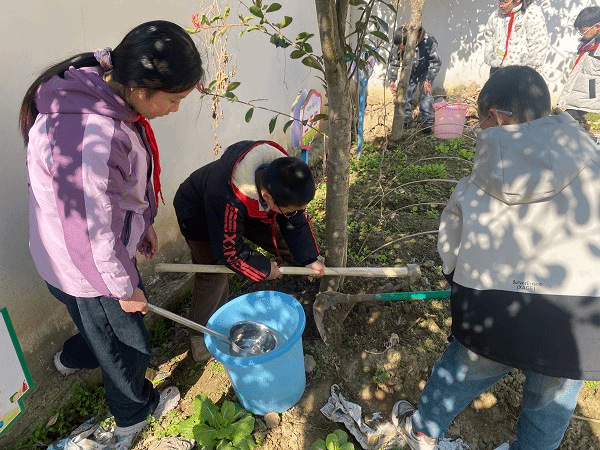 小手添新绿。班会结束后,学生代表在老师带领下来到校园绿化带开展护绿劳动实践。同学们分成小组,领取工具,迅速投入劳动。大家小心翼翼地为花草树木松土,让板结的土壤恢复疏松;拿起小铲子为树根培土,加固根基;拎起水桶细心浇水,滋润每一株植物。尽管泥土沾满了鞋子和双手,孩子们的脸上却洋溢着劳动的喜悦。