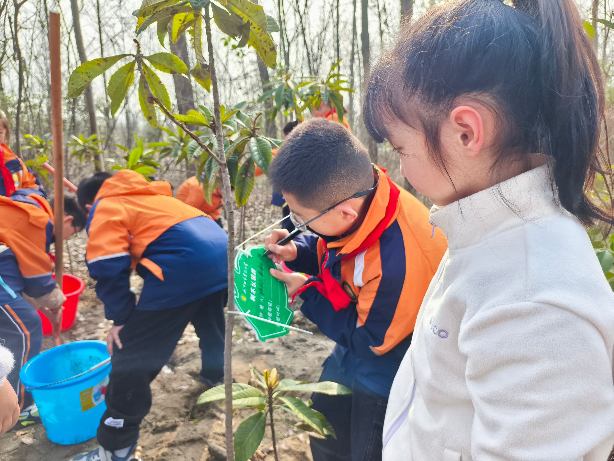 栽种完成后,孩子们还为小树苗挂上了自制的专属“身份证”——写有班级、姓名与美好期许的绿色标牌。“愿小树苗和我一起向阳生长”“守护绿色,从我做起”,稚嫩的字迹里满是纯真的承诺,微风拂过,标牌轻轻摇曳,成为林间最动人的风景。不少同学还自发捡拾林间垃圾,以实际行动践行环保理念,让绿色守护的意识融入每一个细节。