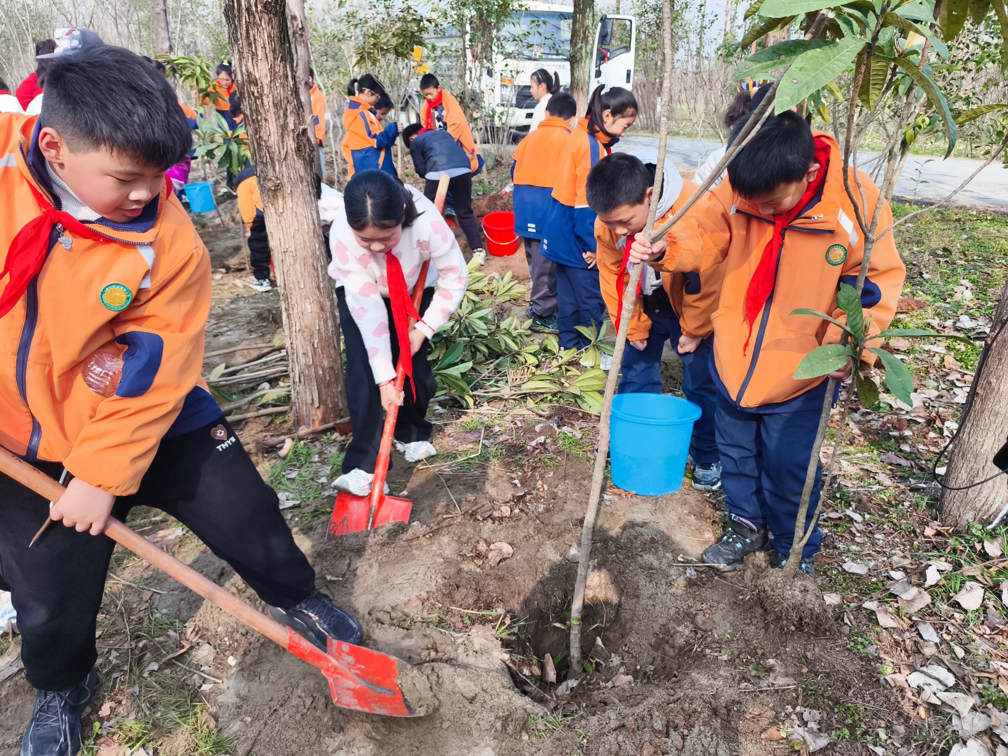 植树过程中,老师们全程耐心指导,不仅示范正确的植树技巧,还向孩子们讲解树木的生态价值、植树的季节要点及养护知识。“小树苗就像同学们一样,需要扎根土壤、汲取养分,才能长成参天大树。”老师的话语,让孩子们在劳动中更深刻地理解了“十年树木,百年树人”的深意。来自五年级(1)班的李同学擦了擦额头的汗水,看着亲手栽好的树苗笑着说:“虽然手上沾了泥,胳膊也酸,但看到小树苗稳稳立在土里,心里特别有成就感。以后我一定会常来看看它,陪它一起长大。”