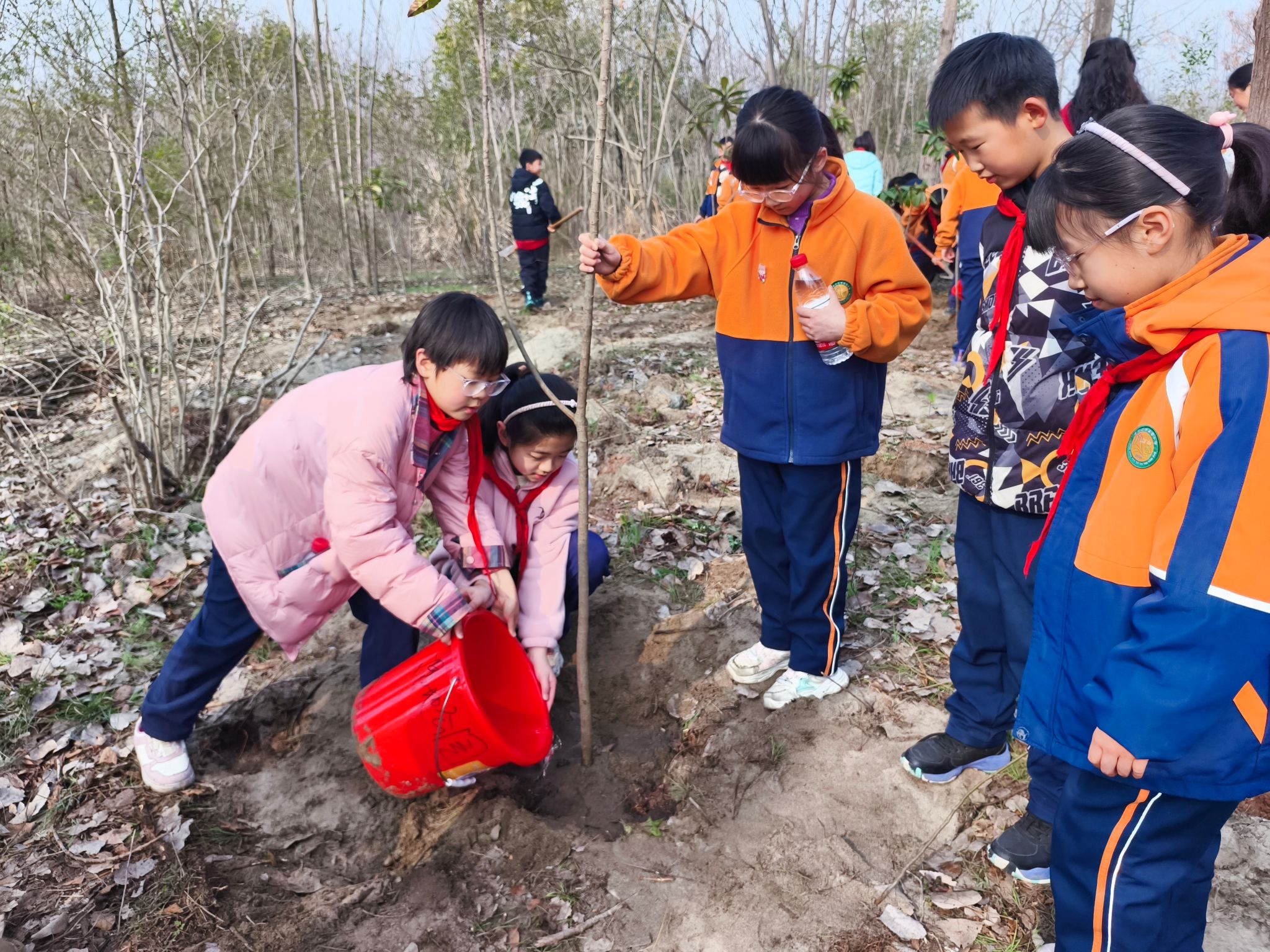 活动当天,阳光和煦,微风轻拂,林间早已备好树苗、铁锹、水桶等工具。在老师的有序组织下,四、五年级师生分工协作、干劲十足,植树现场一派热火朝天的忙碌景象。同学们三人一组、五人一队,严格遵循植树规范:有的挥锹铲土、有的小心翼翼扶稳树苗、有的培土填坑、还有的提水浇灌,清澈的水流顺着桶沿缓缓渗入根部,为新苗注入蓬勃生机。