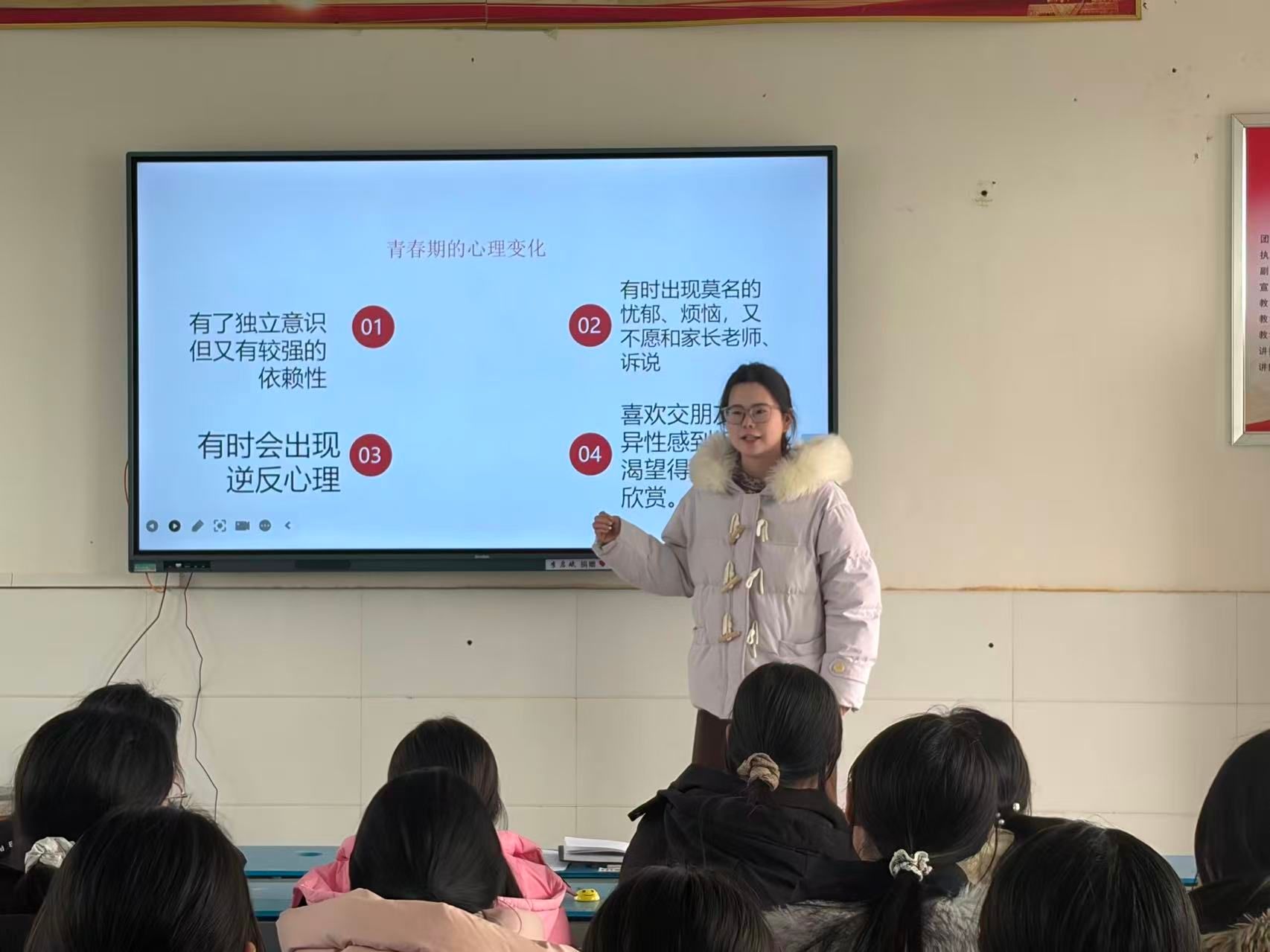 胥联华围绕个人卫生、寝室相处、青春期交友、文明礼仪等内容进行细致讲解,引导女生养成良好习惯、融洽同伴关系、坚守交友原则,号召大家自强自立、奋发向上,勇敢绽放青春光彩。互动环节中,八一班学生喻欣怡结合自身感悟,分享了她对青春期交友“洁身自好”的理解,她说:“成长路上,我们要学会选择朋友,更要守住自己的底线,才能让青春走得更稳。”话音未落,现场便响起了阵阵掌声。