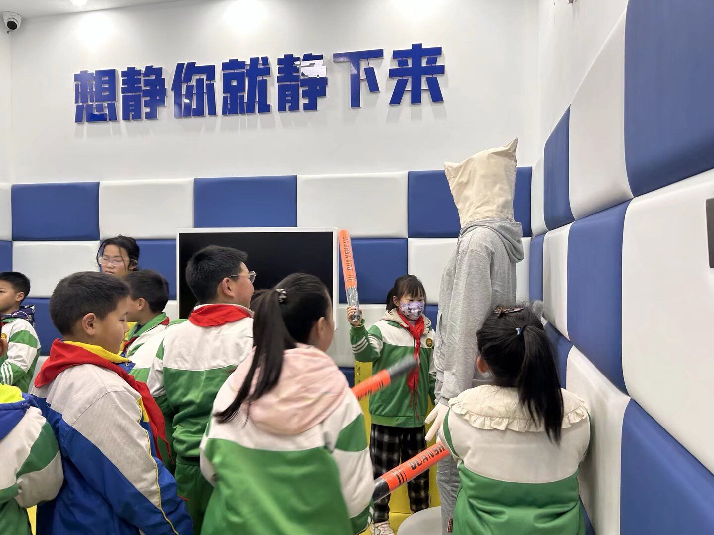在老师的引导下,学生们分批走进音乐沙盘室与情绪宣泄室,亲身参与富有趣味和专业色彩的心理疏导项目。音乐沙盘室内,孩子们通过搭建沙盘场景,将内心情绪悄然表达,在安静而温馨的氛围中获得情绪安抚;情绪宣泄室中,学生们利用呐喊宣泄仪、宣泄假人、拳击设备等器材,以安全文明的方式释放压力、疏导情绪,在动与静的结合中完成了一次次“心灵按摩”。